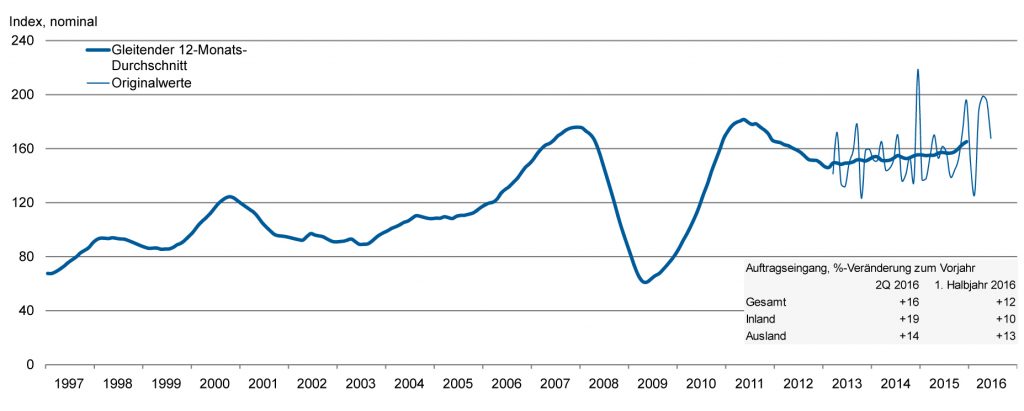 Im 2. Quartal 2016 stieg der Auftragseingang der deutschen Werkzeugmaschinenindustrie im Vergleich zum Vorjahreszeitraum um 16%. Die Inlandsbestellungen lagen mit 19% im Plus, die Auslandsnachfrage stieg um 14%. Dazu trugen der Euro-Raum mit 37% Zuwachs und die Nicht-Euro-Länder mit 10% höheren Bestellungen bei. Im 1. Halbjahr legte der Auftragseingang mit einem Plus von 12% gegenüber dem Vorjahr kräftig zu. Während die Inlandsbestellungen um 10% stiegen, konnten auch die Bestellungen aus dem Ausland um 13% zulegen. Alles in allem befindet sich die Auftragsentwicklung auf einem guten Weg. Der Umsatz schloss im 1. Halbjahr 2016 mit einer schwarzen Null. Für den Folgezeitraum rechnet der VDW mit einer fühlbaren Umsatzsteigerung. Voraussetzung dafür sei allerdings eine konstante Nachfragestabilität. „Auch das 2. Quartal signalisiert grünes Licht für einen Auftragszuwachs im laufenden Jahr. Unsere Geschäfte laufen deutlich besser als zu Jahresbeginn erwartet. Die Branche kann eine solide und ausgeglichene Halbjahresbilanz vorlegen“, sagt Dr. Wilfried Schäfer, Geschäftsführer des Branchenverbands VDW. Die höhere Nachfrage resultiert vor allem aus dem guten Inlandsgeschäft und insbesondere automobilbezogenen Projekten in China und Mexiko. Bezogen auf das 1. Halbjahr 2016 sind für die positive Auftragslage vor allem Sondereffekte maßgeblich verantwortlich.