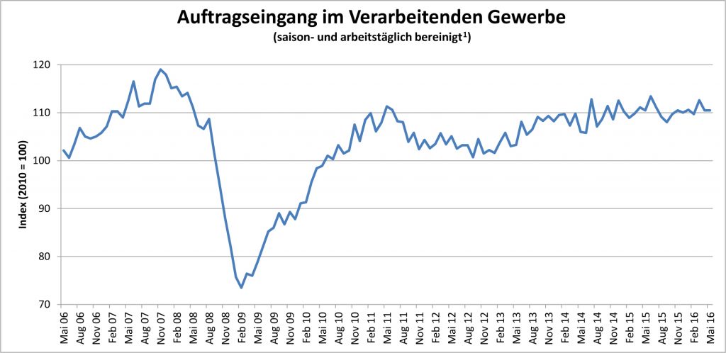 Nach Angaben des Statistischen Bundesamtes und des BMWI sind die Auftragseingänge im verarbeitenden Gewerbe im Mai preis-, saison- und arbeitstäglich bereinigt gegenüber dem Vormonat konstant geblieben. Der Umfang an Großaufträgen war unterdurchschnittlich. Die Auftragseingänge für Vorleistungsgüter nahmen nach dem kräftigen Plus im Vormonat um 2,9% ab und auch die Konsumgüterhersteller mussten einen leichten Rückgang verbuchen (-0,4%). Für Investitionsgüter gingen hingegen wieder mehr Bestellungen ein (+1,9%). Die geringeren Bestellungen aus dem Inland (-1,9%) und aus dem Nicht-Euroraum (-0,3%) wurden durch kräftige Auftragseingänge aus den Ländern des Euroraums (+4,0%) kompensiert. Im Zweimonatsvergleich gegenüber Februar/März gingen die Bestellungen um 0,6% zurück. Im Durchschnitt der Monate April/Mai lagen die Auftragseingänge im verarbeitenden Gewerbe um 0,5 % unter dem durchschnittlichen Niveau des ersten Quartals. Dabei entwickelten sich die Bestellungen aus dem Inland (+1,1%) günstiger als die aus dem Ausland (-1,6%). Die Bestellungen im verarbeitenden Gewerbe blieben im bisherigen Jahresverlauf abgesehen von monatlichen Schwankungen nahezu stabil. Das Geschäftsklima im verarbeitenden Gewerbe hellte sich zuletzt erneut auf und deutet auf eine weiterhin solide Entwicklung hin.