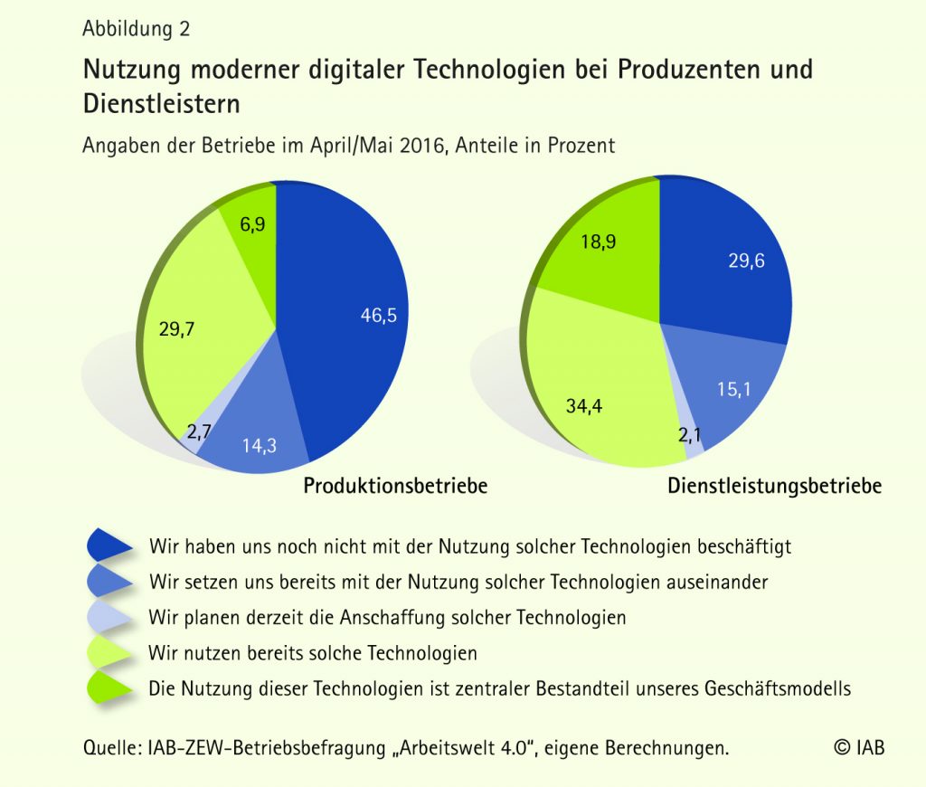 Jeder zweite Betrieb nutzt bereits heute digitale Technologien. Im produzierenden Gewerbe sind das beispielsweise hochgradig vernetzte und automatisierte intelligente Fabriken. Im Dienstleistungsbereich spielen vor allem Online-Plattformen und -Shops, Cloud-Computing-Systeme und Big-Data-Anwendungen eine zunehmende Rolle. Das geht aus einer aktuellen Studie des Instituts für Arbeitsmarkt- und Berufsforschung (IAB) und des Zentrums für Europäische Wirtschaftsforschung (ZEW) hervor. Für 18% der Firmen in Deutschland ist die Nutzung moderner digitaler Technologien bereits heute ein zentraler Bestandteil ihres Geschäftsmodells. Darüber hinaus nutzen 34% der Firmen in Deutschland solche Technologien. Weitere 2% planen deren Anschaffung. 15% setzen sich derzeit mit der Nutzung solcher Technologien auseinander, 31% haben sich noch nicht mit der Nutzung solcher Technologien beschäftigt. Aufgegliedert nach den Sektoren zeigt sich, dass rund 70% der Betriebe im Dienstleistungsbereich mit 50 und mehr Beschäftigten moderne digitale Technologien nutzen oder deren Einführung planen. Produktionsbetriebe mit 50 und mehr Beschäftigten setzen zu rund 50% digitale Technologien ein.
