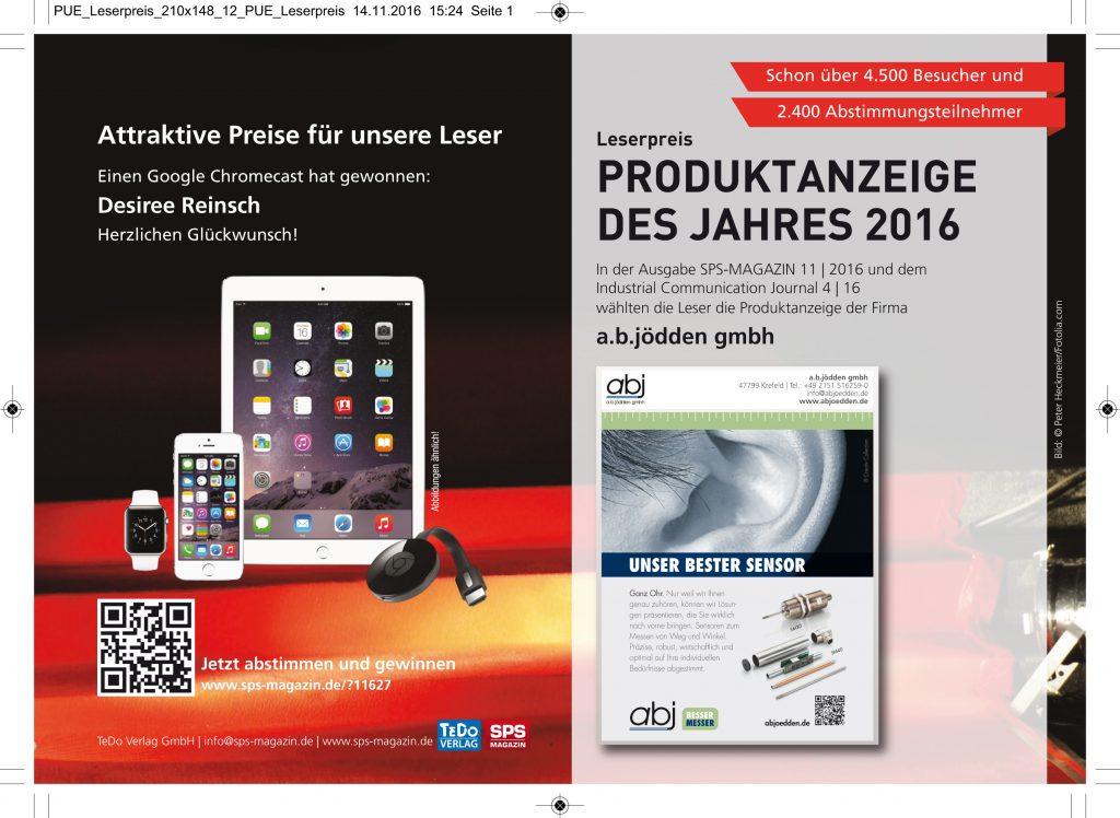 Die Wahl zur Produktanzeige des Jahres ist am 11. November 2016 zu Ende gegangen. Die 13. Runde gewann die Produktübersicht der Firma A.B.Jödden in der Ausgabe 11 des SPS-MAGAZINs und Ausgabe 4 des Industrial Communication Journals. Über einen Google Chromecast freut sich unsere Leserin Desiree Reinsch. Den letztendlichen Leserpreis gewinnt die Gewinneranzeige mit den meisten Leserstimmen. Auf der SPS IPC Drives 2016 wird der Preis an die Gewinnerfirma verliehen.