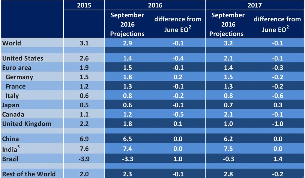 Die OECD (Organisation für wirtschaftliche Zusammenarbeit und Entwicklung) prognostiziert der weltweiten Wirtschaft für das laufende Jahr ein Wachstum von 2,9% (-0,1% im Vergleich zum Juni 2016). Und auch für das nächste Jahr korrigierten die Experten ihre Prognose um 0,1% nach unten (3,2%). Besonders deutlich hat die OECD die Prognose für die USA gesenkt. Dort gingen die Experten im Juni noch von einem Anstieg von 1,8% aus. Dieser wurde nun auf 1,4% korrigiert. Für das kommende Jahr wird für die Vereinigten Staaten ein Wachstum von 2,1% prognostiziert. Für Deutschland geht man von einem Wachstum in Höhe von 1,8% für 2016 aus, was einem Anstieg von 0,2% gegenüber der Juni-Prognose entspricht. Für 2017 prognostiziert die OECD einen Anstieg um 1,5% für die deutsche Wirtschaft. Bedingt durch das Brexit-Votum halbierten die OECD-Experten zudem die Erwartungen für Großbritannien von 2 auf 1%. Für den Euro-Raum rechnet die OECD mit einem Wachstum von 1,5% in 2016 und 1,4% in 2017 (jeweils 0,1% als im Juni). Die Konjunktur in Japan bleibt laut Experten auf einem schwachen Niveau. So wird für 2016 ein Wachstum von 0,6% vorhergesagt (2017: 0,7%). Die Prognose für China liegt für das laufende Jahr bei 6,5% und bei 6,2% für 2017. Beide Werte bleiben im Vergleich zur Juni-Prognose unverändert.