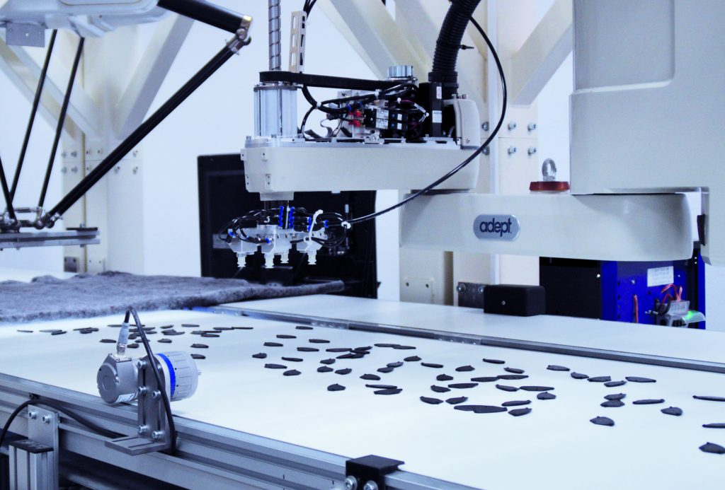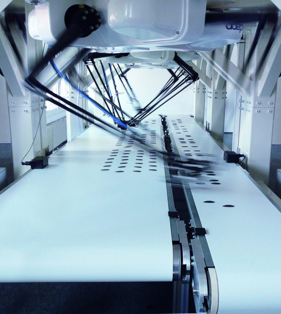 Kleine, mobile Roboter sausen fast lautlos herum und von einem Besprechungstisch wehen englische Sprachfetzen herüber. Würde nicht nebenan die schwarz-gelbe BVB-Kaffeemaschine vor sich hin dampfen, könnte man annehmen, man sei irgendwo im Silicon Valley gelandet. Stattdessen sind wir mitten in Dortmund – im Applikationslabor von Omron Adept Technologies, einem Hersteller von Industrierobotern, der seinen Hauptsitz tatsächlich in Kalifornien hat. Schon seit 1986 befindet sich die Europazentrale für Vertrieb, Service und Training in Dortmund. Im hiesigen Labor finden sich die meisten Produkte des Unternehmens, die so klingende Namen wie Cobra oder Hornet haben, in Funktion wieder. „Wir führen hier vor allem Machbarkeitsstudien durch“, erklärt Schulungsleiter Günter Graß. „Wenn ein Kunde eine Automatisierungslösung sucht, dann kann er hier beispielsweise ausprobieren, ob unsere Roboter die gewünschten Zykluszeiten schaffen“, erklärt er. Automationsaufgaben wurden in den letzten Jahren immer komplexer und die angestrebten Zykluszeiten immer kürzer – hocheffiziente Lösungen sind heute gefragt. Sie müssen innerhalb von Sekundenbruchteilen die sich bewegenden Werkstücke erkennen, aufnehmen und richtig platzieren. Dazu gibt es ganz verschiedene Methoden. Kleine Teile werden häufig mit Hilfe von Druckluft angesaugt. Andere müssen vorsichtig gegriffen werden. Bei wieder anderen ist wichtig, dass sie in einer bestimmten Position zum Liegen kommen. Oft ist es aber mit der reinen Förder- und Zuführtechnik nicht getan. Verpackungsanlagen für Zeitschriften etwa, sorgen vollautomatisch dafür, dass zu jedem Heft ein Gimmick gepackt und das ganze Paket in Folie eingeschweißt wird. Omron Adept Technologies ist gerade bei solchen komplexen Anwendungen ein gefragter Systemanbieter und liefert neben dem Roboter auch die komplette Software und Bildverarbeitung gleich mit. Um den Erfassungsbereich der Kamera und die Bewegung der Greifer präzise aufeinander abzustimmen, ist es wichtig, die Bandgeschwindigkeit exakt zu messen. Nur wenn sie bekannt ist, kann die Steuerung errechnen, wann das Werkstück beim Greifer ankommt und aufgenommen werden kann.
