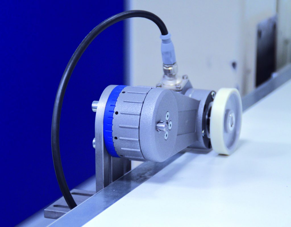 Besonders praktisch ist die Möglichkeit, mit einem Handgriff den Federarm in eine Ruheposition zu versetzen und dort zu fixieren. „Für Wartungs- oder auch Reinigungsarbeiten müsste man sonst immer das ganze System entfernen und nachher wieder justieren. So können wir mit einem Handgriff den Arm vom Band heben, oben lassen und später einfach wieder absenken. Das System arbeitet passgenau und mit dem ursprünglichen Anpressdruck weiter.“, führt Graß die Vorteile der Handhabung des Längenmesssytems aus. Für die eigentliche Geschwindigkeitsmessung ist ein inkrementaler Drehgeber zuständig, der hohe Lagerlasten verträgt. Mit Auflösungen zwischen 1,0 und 0,008mm/Impuls kann er mit den hohen Geschwindigkeiten der Robotersysteme problemlos Schritt halten.
