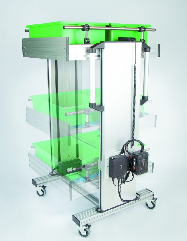 Standzeiten reduziert. Eine weitere Applikation ist das ergonomische Arbeiten in manuellen Materiallagern mit verschiedenen Ebenen. Während die schweren Materialkisten bisher umständlich und unergonomisch von den Mitarbeitern entnommen werden mussten, sind nun mobile höhenverstellbare Materialhubwagen einsetzbar. Durch den Akkubetrieb können die Materialhubwagen flexibel verschiedene Arbeitshöhen anfahren. Schwere Kisten lassen sich über Rollenbahnen aus dem entsprechenden Lagerfach auf den Hubwagen ziehen. Schwere körperliche Arbeit entfällt.