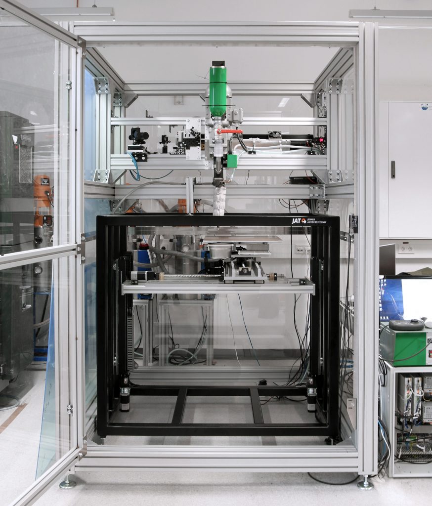 Im Rahmen eines Forschungsprojektes hat die Ernst-Abbe-Hochschule in Jena einen 3D-Drucker mit Mehrachs-Antriebssystem für großvolumiges Schmelzschichten entwickelt. Die Anlage wurde in Kooperation mit JAT umgesetzt und in Betrieb genommen. Der Drucker erlaubt bei nahezu uneingeschränkter Werkstoffauswahl einen Materialaustrag zwischen 1 und 6kg pro Stunde. Auf Seite der Antriebstechnik sind Spindelachsen mit vier Synchronservomotoren Ecostep 23S verbaut. Der Granulatextruder mit Druckdüse ist fest am Maschinengestell montiert. Das Achssystem, konstruiert als Gantry, positioniert die Bauplattform in XYZ-Richtung. Während des Druckvorgangs nimmt die Bauplattform zusätzlich zu ihrem Eigengewicht bis zu 90kg Druckmaterial auf. Um die Synchronfahrt der Achsen und die benötigte Positioniergenauigkeit mit dieser Lastmasse über den gesamten Hub von 550mm sicherzustellen, wurden Servoverstärker der Baureihe Ecovario eingesetzt.