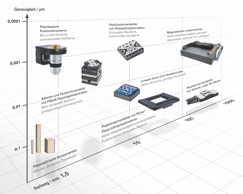 Die ASC Motion Controller Plattform arbeitet als Ethercat Master, der alle Knoten (Servocontroller-, I/O- und Sensormodule) im Ethercat-Netzwerk koordiniert. Die Controller sind modular aufgebaut, skalierbar und kommunizieren mit der übergeordneten Maschinen- oder Anlagensteuerung über verschiedene Ethernet-Protokolle. Universelle Controller-Module (UCM) sind für die Servosteuerung verantwortlich. Alle Strom-, Geschwindigkeits- und Positionsschleifen werden mit einer Frequenz von 20kHz unabhängig von der Anzahl der Achsen verarbeitet, was die Voraussetzung für eine hohe Synchronisation und Dynamik mit geringen Fehlern ist. Die Motion Controller verbessern das stabile Halten der Position ebenso wie die Step- und Settle-Zeiten durch leistungsfähige Regelalgorithmen, wie die Servoboost-Funktion und das Profile Shaping, das etwa Systemschwingungen zuverlässig unterdrückt. Spezielle patentierte Controllerfeatures wie NanoPWM und die DRBoost-Funktion ermöglichen eine dynamische Reichweite von über 100.000:1. Dadurch werden Trackingfehler beim Waferscannen auf Nanometer begrenzt und in der Messtechnik wird die Position im Subnanometerbereich gehalten. Dazu kommen umfangreiche Trigger-Funktionalitäten z.B. für Laseranwendungen oder Inspektionsfunktionen. Eine integrierte 3D-Kompensation von Positionierfehlern sowie die Kompensation des Gierens bei Gantrylösungen ermöglichen die Realisierung von Anwendungen mit hohen Genauigkeitsanforderungen. Der eigene Servoboost Algorithmus detektiert Störungen in Echtzeit, identifiziert die Ursache und reduziert den Effekt. Er erleichtert die Inbetriebnahme und die Verbesserung der Performance bei wechselnden Lasten oder bei Wechselwirkungen mehrerer Achsen auf demselben Rahmen. Das Resultat ist eine sehr stabile und robuste Regelung mit hoher Positioniergenauigkeit und kurzen Einschwingzeiten. In Kombination mit den Linear- und Rotationsachsen, Parallelkinematiken und Planarscannern sind diese Controller Teil einer kundenspezifisch auslegbaren Komplettlösung von PI.