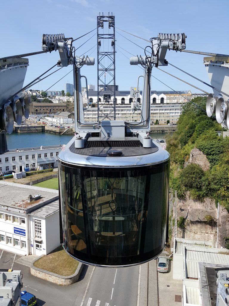 Die Stadt Brest will mit der urbanen Seilbahn die Stadtentwicklung entlang der Flussufer und die geschäftlichen Beziehungen zwischen beiden Seiten fördern. Über 420m hinweg verbindet sie das Stadtzentrum mit dem neuen Bezirk Capucins, der auf 16ha eines ehemaligen Militärgeländes neu entsteht. Das System basiert auf origineller und innovativer Technik: Die beiden Gondeln kreuzen sich übereinander und nicht wie üblich nebeneinander auf gleicher Höhe. Beide Kabinen kommen an ihren Endpunkten somit auf der gleichen Plattform an. Die Ausmaße des Systems und der Endstationen fallen damit kleiner aus, was auch zu geringeren Baukosten führte. Die Gondeln bewegen sich über nur einen Stahlmast, der sich in die Umgebung mit Werften und Kranen passend einfügt. Jede Gondel ist an zwei Tragseilen mit 50mm Durchmesser befestigt, die ein Gewicht von 88t aufweisen. Die Gegengewichtswirkung, wie sie bei Anlagen in Bergen zu beobachten ist, wird hier vermieden, da die Gondeln sich über den größten Teil der Strecke gleichzeitig bewegen.