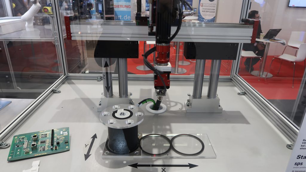 In einer immer wandlungsfähigeren Produktion müssen Fertigungsprozesse auf schnelle Produktlebenszyklen flexibel reagieren können. Ein Fokus im Sinne von Industrie 4.0 liegt deshalb darauf, rekonfigurierbare Automatisierungsstationen für den Produktionsablauf zu gestalten. Dadurch kann flexibel auf veränderte Produktionsanforderungen eingegangen und die Station je nach Bedarf angepasst, grundlegend verändert oder neu aufgebaut werden. Diese Motivation begründet das Forschungsprojekt Devekos (Durchgängiges Engineering für sichere, verteilte und kommunizierende Mehrkomponentensysteme) des BMWi. In dessen Rahmen werden Automatisierungskomponenten entwickelt, die mit in die Komponente integrierter Miniatursteuerung flexibel miteinander kombiniert werden können. Dabei wird auf zentralen Koordinations- und Recheneinheiten verzichtet. Stattdessen werden die Miniatursteuerungen selbst mit der Planung und Durchführung des Prozesses betraut. Eine besondere Herausforderung bei der Umsetzung von Produktionsprozessen mit dezentralen Steuerungen ist die bahngenaue Bewegung von mehreren positionierenden Komponenten. Hier zeigte das ISW auf der Fachmesse SPS 2019 einen Demonstrator, der über ein dezentrales Ansteuerkonzept bahntreu im Raum verfährt. Auch bei Änderungen im System zu Laufzeit, etwa der Veränderung der verfügbaren Geschwindigkeit von einzelnen Achsen, stellt dieses Ansteuerkonzept sicher, dass der Gesamtverbund aller an der Bewegung beteiligten Achsen sich mit möglichst geringer Bahnabweichung bewegt.