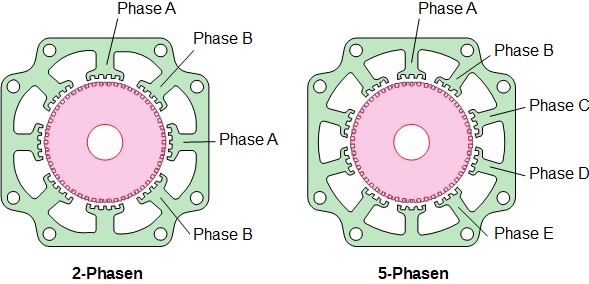 Es gibt zwei wesentliche Unterschiede zwischen 2-Phasen- und 5-Phasen-Schrittmotoren. Der Erste ist mechanisch bedingt. Ein Schrittmotor besteht grundsätzlich aus Stator und Rotor. Der Rotor wiederum setzt sich aus drei Komponenten zusammen: zwei Rotorsegmenten und einem Permanentmagneten. Bei einem 2-Phasen-Motor besteht der Stator aus acht Magnetpolen mit kleinen Zähnen, beim 5-Phasen-Motor hingegen aus zehn Magnetpolen. Die Pole im Stator sind jeweils mit einer Wicklung versehen. Der zweite Unterschied besteht in der Anzahl der Phasen. Ein 2-Phasen-Motor hat lediglich eine A- und eine B-Phase, während ein 5-Phasen-Motor über fünf Phasen verfügt. Die Anzahl der Phasen bezieht sich im Wesentlichen auf die verschiedenen Polkombinationen des Stators, dessen Wicklungen mit Strom durchflossen werden, um mit Hilfe des Drehfeldes Wechselwirkungen mit dem Rotor zu erzeugen. Wie wirken sich diese Unterschiede nun auf die Leistung aus? Ohne die gebräuchlichsten Antriebsmethoden Wave Drive, Vollschritt, Halbschritt und Mikroschritt zu berücksichtigen, werden im Folgenden die wichtigsten Spezifikationen für 2- und 5-Phasen-Schrittmotoren dargestellt.