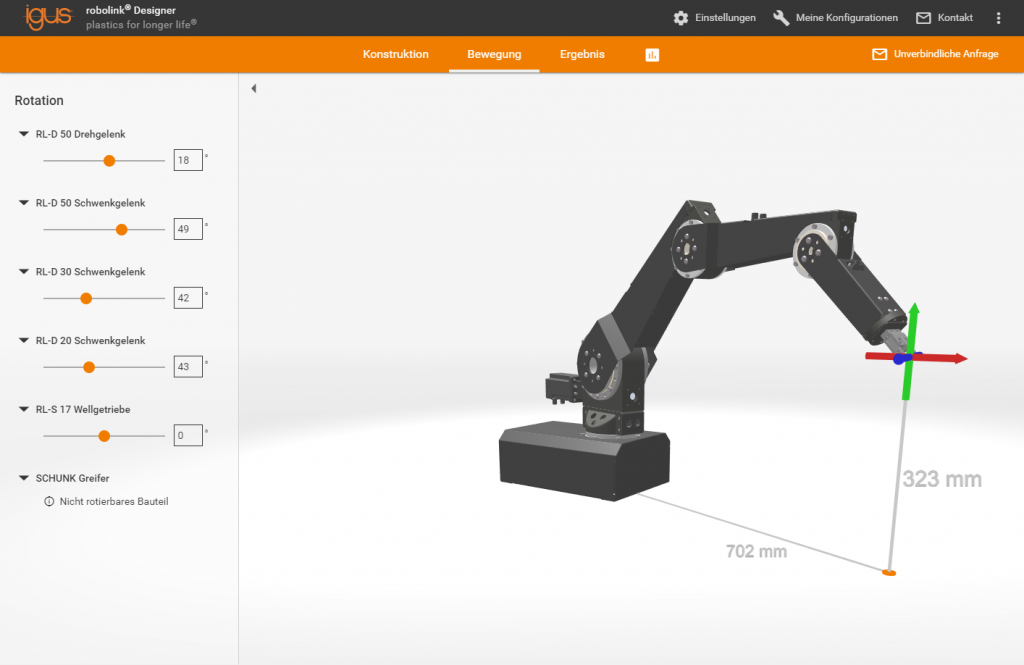 Zudem will das Unternehmen mit einer Digitalisierung der Prozesse sowohl seinen Kunden als auch seinen Mitarbeitern moderne Methoden an die Hand geben. Die technischen Verkaufsberater können mit den Online-Konfiguratoren direkt beim Kunden vor Ort spezifische Vergleiche und Plausibilitätsprüfungen anstellen und sofort berechnen wie sich z.B. eine Neukonstruktion auf Lebensdauer und Kosten auswirkt. Ingenieure und Konstrukteure können die Online-Tools rund um die Uhr bei der Planung ihrer Projekte zu Rate ziehen. Teamfunktionen der Konfiguratoren erleichtern die Arbeit über die Abteilungen hinweg. Sowohl die Produktfinder, als auch die Konfiguratoren helfen dabei, schnell und einfach passende Lösungen zu finden. Im Robolink Designer z.B. werden die Roboterarme in einer zoom- und drehbaren 3D-Ansicht dargestellt. Traglast und Reichweite der eingesetzten Bauteile werden dabei in Echtzeit ausgegeben. Beim Drylin-Gewindespindelkonfigurator kann der Kunde seine konfigurierte Spindel online jederzeit wieder aufrufen, auch wenn er die Bestellung erst zu einem späteren Zeitpunkt absetzen will. Was im Hintergrund des jeweiligen Konfigurators abläuft ist mitunter sehr komplex – die Handhabung für seine Kunden hat Igus jedoch einfach und intuitiv gestaltet.