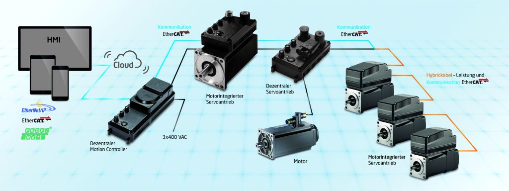 Der dezentrale Motion Controller iSA in IP65-Ausführung bietet zusätzlich zu seiner Steuerungsintelligenz eine integrierte Einspeisung, die für 5kW Dauerleistung ausgelegt ist. Am Ethercat-Master wurden bereits Applikationen mit 36 Antrieben realisiert. Die iSA-Serie kann auch als Gateway für Ethernet/IP, Profinet und Ethercat eingesetzt werden. Ihre Rechenleistung bildet die Grundlage für schnelle und präzise Motion Control mit ausreichend Luft für die Ablaufsteuerung und falls notwendig für die Visualisierung. Die Motion Controller verfügen über eine integrierte 24V-Versorgung und es bedarf nur der Leistungsversorgung mit 3x400VAC um die DC-Versorgungsspannung für die Servoantriebe zu erzeugen.