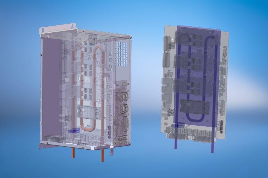 Das leistungsstarke Kühlkörpersystem hält mit der permanenten Weiterentwicklung der IGBTs und anderer elektronischer Leistungsmodule mit. Obwohl es auf Standardelementen basiert, stellt es eine kostengünstige Lösung zur konzentrierten, effizienten Wärmeabfuhr bei Leistungshalbleitern dar. Das Kühlsystem genügt der Richtlinie IEC77 und verursacht weder Geräusche noch Vibrationen. Es besteht aus einer Zirkulationspumpe, einem Ausgleichsbehälter, einem Wärmetauscher und der eigentlichen Kühlplatte. Sie besteht wahlweise aus Aluminium oder Kupfer mit kernlochgebohrten oder extrudierten Kühlkanälen zur Realisierung des Wasserkreislaufs. Eine weitere Alternative ist eine Aluminiumplatte (Dicke 15 bis 20mm) mit eingepresstem Kupfer- oder Edelstahlrohr, das in der Regel einen Außendurchmesser von 10mm und eine Wandstärke von 1mm besitzt.
