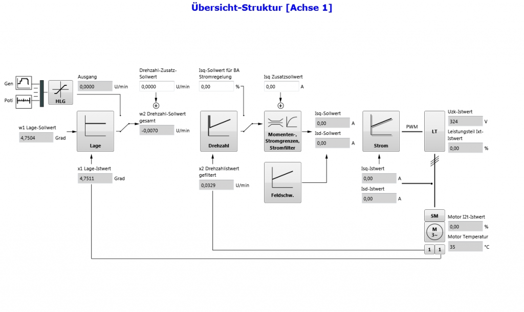 Eine besondere Stärke der Software sind die grafischen Darstellungen. Wer kein Freund von unübersichtlichen Parameterlisten ist, dem wird hier geholfen. So kann etwa der Signalfluss im Regler in einer grafischen Übersicht angezeigt werden, das verbessert das Verständnis und die Orientierung in der Anwendung deutlich. Standardfunktionen sind in ProDrive direkt über eine Icon-Liste schnell und mit nur einem Klick zu erreichen. Nach einzelnen Parametern kann mit Nummer oder aber einfach mit Klartext gesucht werden. Informative Überwachungsseiten geben alle wichtigen Informationen auf einen Blick (z.B. Lageregler, Stromregler, Temperatur, Netzspannung oder Zwischenkreisspannung). Weil alles so einfach und schnell zu finden ist, sind Fehlbedienungen unwahrscheinlich und der Zeitaufwand gering. Durch die Unterstützung des Inbetriebnahme-Wizards können auch unerfahrene Mitarbeiter die Geräte in nur wenigen Minuten in Betrieb nehmen. Der Wizard führt unkompliziert und schnell durch die einzelnen Schritte der Inbetriebnahme. Detaillierte Vorkenntnisse zur Parametereingabe sind dadurch nicht mehr notwendig. Profis finden natürlich auch vollständige Parameterlisten und können etwa eigene Parametergruppen erstellen oder kundenspezifische Seiten anlegen.