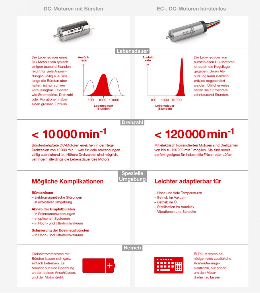 Wer in der Antriebstechnik auf kompakte Gleichstrommotoren setzt, muss eine Wahl treffen: zwischen bürstenbehafteten (DC) und bürstenlosen (BLDC) Motoren. Letztere werden bei Maxon auch EC-Motoren genannt (elektronisch kommutiert).