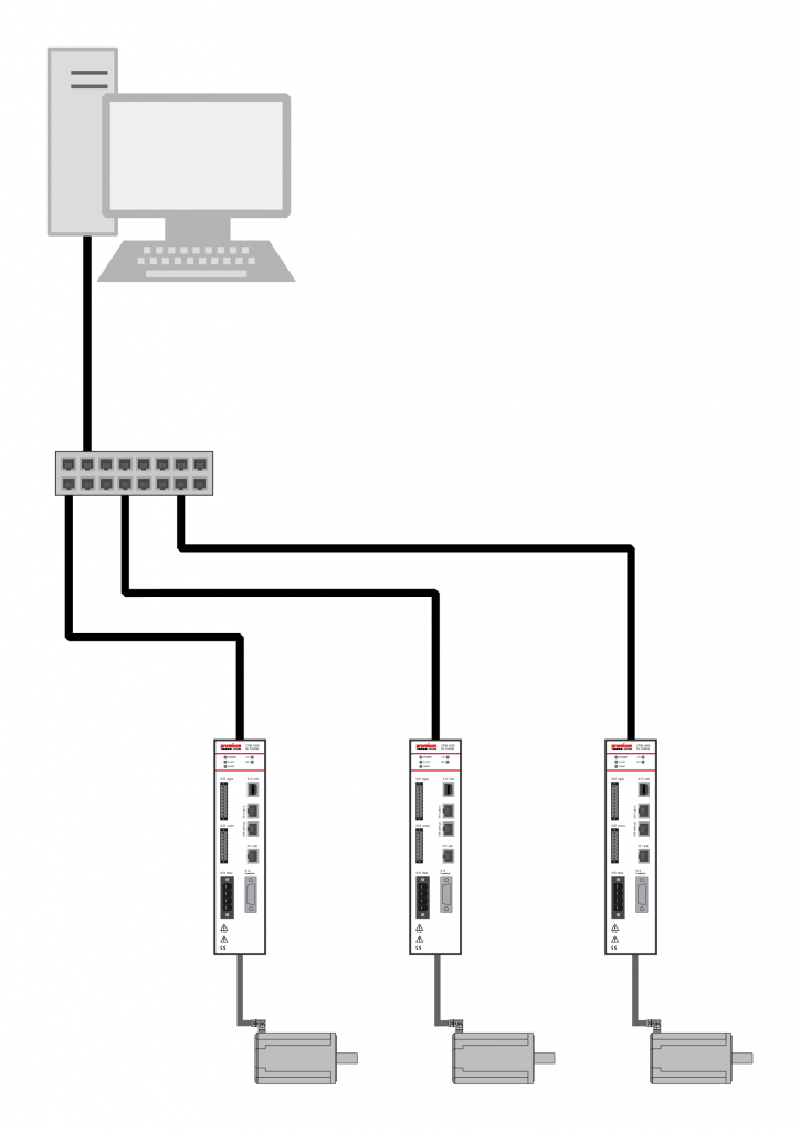 Eine weitere Möglichkeit den Servoregler anzusteuern besteht über Ethernet und das TCP/IP-Protokoll. Diese Methode ist besonders für Industrie-PCs interessant, da sie standardmäßig über einen Ethernet-Anschluss verfügen und das TCP/IP-Protokoll leicht in Applikations-Software integrierbar ist. Die Kommunikation erfolgt über pNET-Telegramme und erlaubt den Zugriff auf Parameter, Variablen, Objekte, Funktionen sowie I/Os des Servoreglers. Hierdurch entsteht eine breite Vielfalt von Möglichkeiten.