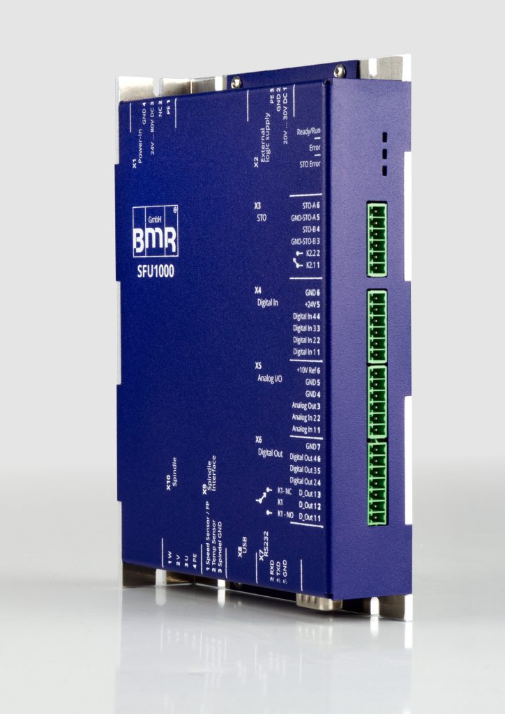 Zur SPS 2022 präsentiert BMR den kompakten Frequenzumrichter SFU1000 in Modulbauweise für den Schaltschrank mit einer Dauerausgangsleistung von mehr als 1.000VA. Erreicht wurde das u.a. durch die Erhöhung des Ausgangsstroms auf 12A, um auch größere Spindeln mit mehr Strombedarf antreiben zu können und dies bei 55VAC Ausgangsspannung. Für die flexible Einbindung in die spezifische Applikation beim Anwender vor Ort stehen jeweils vier frei parametrierbare Eingänge und Ausgänge zur Verfügung. Drei Ausgangskanäle sind jetzt als aktive Ausgänge mit 0 bis 24V Pegel realisiert und können damit direkt SPS-Eingänge ansteuern. Zur Schaltung potentialfreier Signale ist ein weiterer Ausgang als Relais mit Wechsler-Kontakten konzipiert. Alle Anschlüsse sind als steckbare Schraubklemmen für Leiterquerschnitte bis zu 1,5mm² ausgeführt. Die STO-Funktion verhindert, dass eine Spindel im Stillstand bei Servicearbeiten an der Maschine unbeabsichtigt anlaufen kann. Der Umrichter eignet sich für kleinere oder mittelgroße Fräs- und Schleifautomaten sowie für alle CAD/CAM-Systeme mit Hochdrehzahlantrieben.