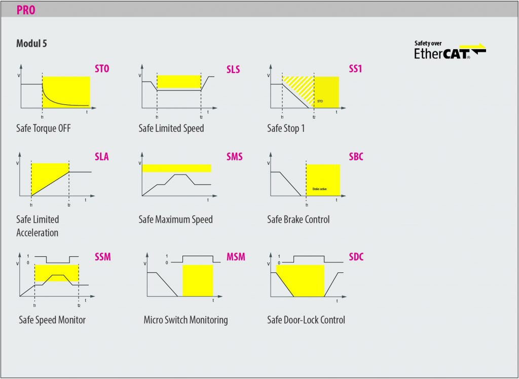• SSM (Safe Speed Monitor) und SMS (Safe Maximum Speed): SSM liefert ein sicheres digitales Signal zur Geschwindigkeitsüberwachung mit dem andere Anlagenteile angesteuert werden können. SMS überwacht permanent eine maximale Geschwindigkeit, ohne die Überwachung extra aktivieren zu müssen.