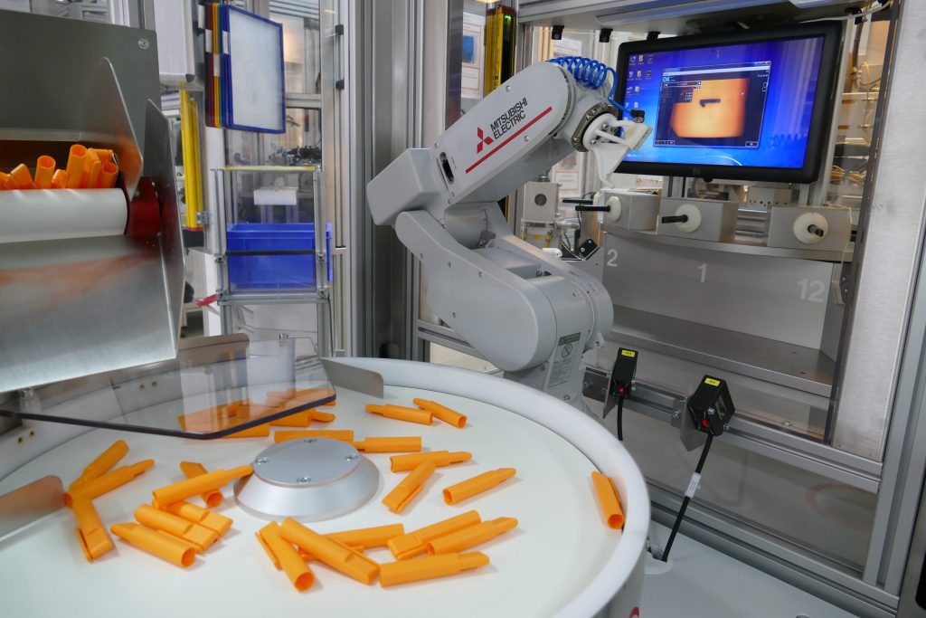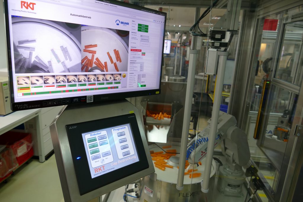 „Wir haben am Standort rund 40 Roboter von Mitsubishi Electric im Einsatz, die wir in den unterschiedlichen Spritzgussanlagen zum Entnehmen der frisch gespritzten Kunststoffteile verwenden. Unsere bisherigen Erfahrungen waren dabei immer sehr gut“, erklärt Jonas Barke, Prozesstechniker Automatisierung bei RKT. „Bei der Entwicklung unserer neuen Tampondruckzellen haben wir daher von vorneherein wieder auf diese Technik gesetzt.“ Ein wesentlicher Entscheidungsgrund für die Auswahl des Robotermodells war dessen hohe Wiederholgenauigkeit von ±0,02mm. Die unbedruckten Kappen werden über einen Flexibowl-Förderteller bereitgestellt und ihre Lage von einem darüber angebrachten Vision-System erkannt. Sobald die Bildauswertung durchgeführt ist, empfängt der Roboter die Lagekoordinaten einer gut positionierten Kappe, greift diese und steckt sie dann mit einer festgelegten Orientierung auf den nächsten freien Stift des nachfolgenden Rundtaktautomaten. Dort werden die Kappen dann vorbehandelt und bedruckt. Um einen fehlerfreien Druck erzielen zu können, ist nur wenig Spielraum zwischen Kappenaufnahme und -durchmesser. Der Roboter muss die Kunststoffteile daher sehr exakt an den Rundtaktautomaten übergeben.