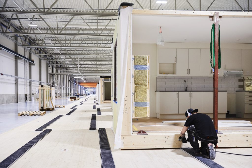 Die 322m lange und 96m breite Werkhalle in Piteå umfasst einen Produktions- und Logistikbereich von 31.000qm und wurde so gestaltet, dass alle Abläufe aufeinander abgestimmt sind. Digitalisierungs- und Automatisierungslösungen spielten dabei eine wesentliche Rolle. Das Ziel: eine schlankere Produktion und damit eine Steigerung der Effizienz. Angestrebt ist eine Verdreifachung der Fertigungskapazitäten. Halbstündlich sollen 40qm-Wohnungsmodule gefertigt werden – also 1.600 Wohnungen pro Jahr.