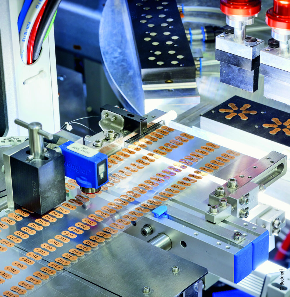 Zu den vielfältigen Prozessabläufen innerhalb der mit Beckhoff Steuerungs- und Antriebstechnik ausgestatteten Verpackungslinie gehört zunächst die Herstellung der Blister. Diese entstehen aus einer zugeführten Folie, die erwärmt sowie entsprechend geformt und gestanzt wird. Über ein Palettensystem werden die Blister weitertransportiert und mit den – zuvor elektrisch und in der Anlage selbst auf korrekte Etikettierung optisch geprüften – Mikrobatterien bestückt. Dann wird der Blister mit einer Karte zur Einzelpackung verschlossen und diese mit einem Qualitätsetikett und dem Haltbarkeitsdatum versehen, was ebenfalls über Kameras geprüft wird. Abschließend stapelt die Anlage die Einzelpackungen in einer kleinen Faltschachtel, bevor diese – auf das Füllgewicht und ihre eigene Etikettierung hin geprüft – wiederum in einer größeren Transportverpackung gruppiert werden.