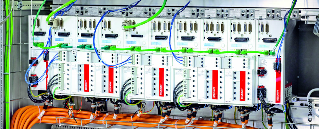Die PC-basiert mit Twincat NC I gesteuerte Antriebstechnik sorgt innerhalb der gesamten Anlage für schnelle und präzise Prozessabläufe. Realisiert sind die rund 50 Servoachsen über die Servoverstärker der Reihe AX5000 und die Servomotoren AM8000 von Beckhoff. Die effiziente Bauraumnutzung ist dabei ein wichtiger Punkt für Michael Bühler: „Wir setzen bei Koch Pac-Systeme konsequent auf die One Cable Technology (OCT). Das spart enorm Material- und Installationsaufwand sowie Platzbedarf. Hinzu kommen weitere Vorteile wie z.B. die Vermeidung von Verdrahtungsfehlern und das elektronische Typenschild. Für die effiziente Nutzung des verfügbaren Bauraums setzen wir in unseren Maschinen möglichst auch die kompakte Antriebstechnik von Beckhoff ein, vor allem die 48V-Ausführungen der Servomotorklemmen EL/ELM72xx bzw. der Ethercat-Box-Module EP72xx. In manchen Applikationen machen diese bereits über 30 Prozent der Servoachsen aus.“