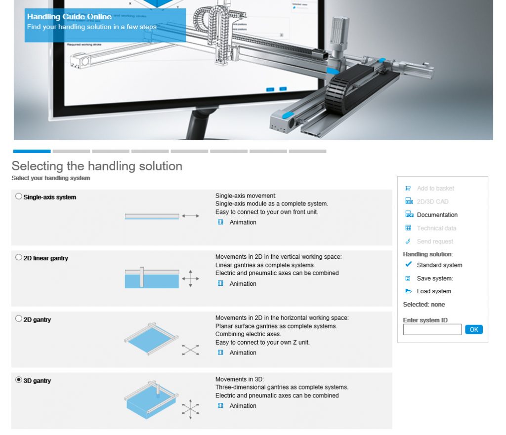 Mit dem Handling Guide Online von Festo können Konstrukteure und Projektingenieure Handling-Lösungen konfigurieren und erstellen. Dafür sorgt die Einbindung der Konfigurations- und Bestellplattform in den Online-Produktkatalog des Unternehmens. So erhalten Planer mit wenigen Mausklicks ihr passendes Standard-Handlingsystem inklusive CAD-Modell. Die Einzelschritte Anfrage, Auslegung, Angebot und CAD-Konstruktion, für die bisher zehn bis 15 Tage einzuplanen waren, verkürzt das Tool auf wenige Minuten.