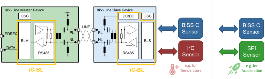 Nun ist auch die Einkabeltechnologie BiSS Line offengelegt, mit der für die Übertragung von Energie und Daten durch Modulation anstelle von sechs nur noch zwei oder wahlweise vier Adern benötigt werden. Die Datenübertragung mit 12,5MBit/s erfolgt dabei über bereits vorhandene Infrastrukturen unter Verwendung des etablierten Physical Layer RS-485 (halb-duplex). Übertragungsstrecken von bis zu 100m sind hierbei möglich. Die neben der Einkabeltechnologie vielleicht wichtigste Neuerung gegenüber BiSS C ist die Forward Error Correction, welche die Kommunikation via BiSS Line nun noch deutlich robuster macht.