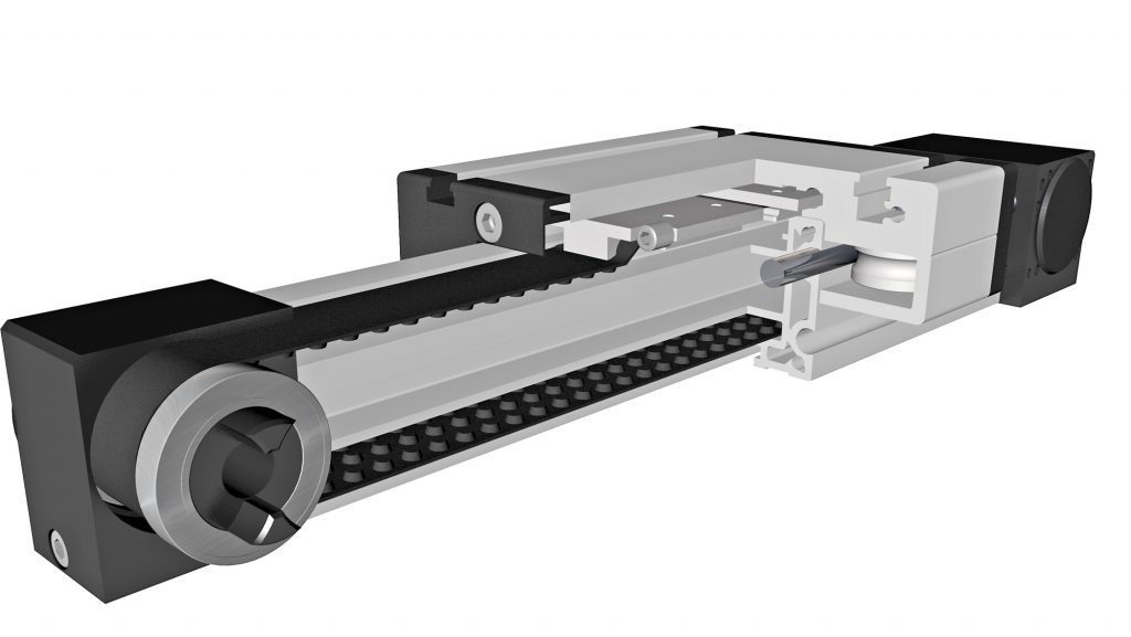 Für präzise, geräuscharme Verfahrwege bietet Bahr Modultechnik die Positioniersysteme der Baureihe ML jetzt in der neuen Variante MLN 60(S) an. Der selbstführende 30mm breite Antriebsriemen ist aus abriebfestem Polyurethan mit verstärkenden Stahlcordzugsträngen gefertigt. Die Antriebseinheit mit versetzten Noppen erübrigt den Einsatz von Bordscheiben und reduziert durch annähernd vibrationsfreie Übergänge die Laufgeräusche. Der Führungsschlitten wird mittels vier einfach nachstellbarer Laufrollen entlang der integrierten Führungswelle verfahren. Mit diesem Antriebs- und Führungskonzept erreichen die Positioniersysteme eine Wiederholgenauigkeit von ±0,1mm. Zur Montage in beliebigen Einbaulagen liefert der Hersteller die Einheiten auch mit im Profil geführtem, stahlgewebeverstärktem HTD-Zahnriemen.