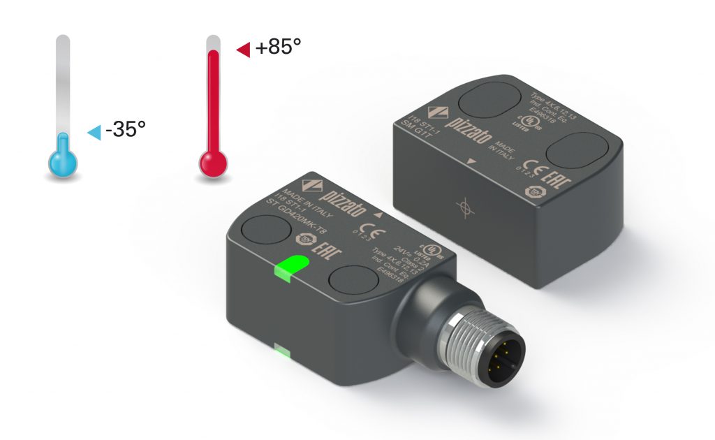 Bestehen erweiterte Temperaturbereiche, etwa in Kühl- oder Outdoor-Anwendungen? Pizzato Elettrica bietet für diese Geräteklasse eine Technologie mit Leistungsdaten, die von -35°C bis +85°C konstant bleiben. Die Schutzarten IP 67 und IP 69K sind ebenfalls erfüllt. Damit deckt ST-G auch obige Einsatzfälle ab. Müssen unterschiedliche Zustände überwacht werden, etwa den Schiebetor-Status AUF/ZU oder die vier Positionen eines Maschinen-Drehtellers oder Werkzeug-Revolvers, löst der Anbieter das Problem mit der Multi-Tag-Funktion. Der ST-G RFID-Sensor mit Multi-Tag-Funktion wird wahlweise mit mehreren Betätigern und hoher Kodierungsstufe ausgeliefert, die alle direkt zugeordnet sind und sicher erkannt werden. Die interne Firmware des Sensors kann ab Werk so programmiert werden, dass sie bis zu 16 Codes speichert und für jeden einzelnen erkannten Betätiger ein separates Verhalten des Sensors vorsieht. Sie überträgt über ein serielles Signal die Information des Betätigers, der sich gerade vor dem Sensor befindet. Dieses Signal kann beispielsweise an eine SPS gesendet und dort verarbeitet werden, um komplexe Maschinenfunktionen zu steuern. Bei der Ablage hydraulisch bewegter Betonpumpen, Feuerwehrleitern, Liftern, etc., bei denen zwangsläufig größere Bewegungstoleranzen entstehen, sind zudem Betätiger mit größerem Schaltabstand lieferbar. Für Anwendungen mit schwierigen Platzverhältnissen, z.B. bei Pick-to-Light-Anlagen, sind auch sehr schlanke Betätiger erhältlich. Dadurch reduziert sich der Montageaufwand und ein Eingreifen wird verhindert. Die RFID-Serie ST-G ist durch den TÜV-Süd, UL, CSA und ECOLAB auf die relevanten Normen zertifiziert.