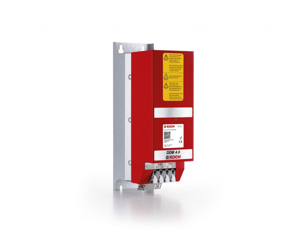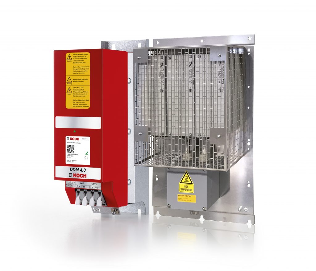 Im gleichen Gehäuse wie die gesamte Reihe der dynamischen Energiespeicherlösungen von Koch unterscheidet sich der DDM 4.0 nicht nur in der eingesetzten Hard- und Software, sondern auch durch eine veränderte Front innerhalb der Gerätefamilie. Angeschlossen wird das Gerät über die zwei rechten frontseitigen Federzugklemmen direkt an den Plus- und Minuspolen des Gleichstrom-Zwischenkreises. Mit den beiden linken Klemmen werden die Litzen des sicheren Bremswiderstands angeschlossen. Die für den Verbund ausgewählte Einheit ist in Schutzart IP65 ausgeführt. Der Lastwiderstand kann also auch außerhalb des Schaltschranks montiert werden, um ihn von Wärmeenergie zu entlasten. Auf eine Dauerleistung von 3,6kW ausgelegt, nimmt er eine anstehende Energiemenge von maximal 2MJ auf und setzt diese in Wärme um. Applikationsabhängig können auch sichere Bremswiderstände höherer Leistung ausgewählt werden.