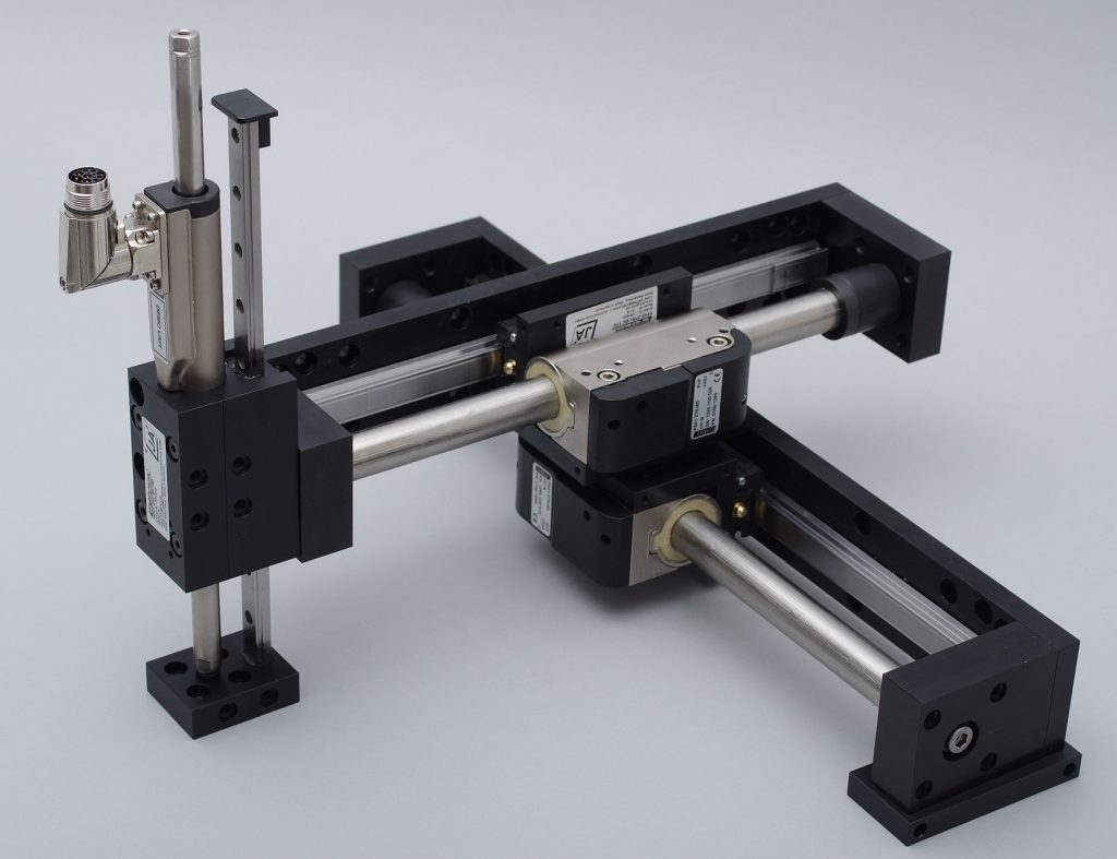 Die kompakten Raumportale von Jung Antriebstechnik u. Automation sind als einfache und kostengünstige Systemlösungen zur Realisierung automatisierter Handling-, Positionier-, Palettier-, Prüf- und Fügeprozesse ausgelegt. Sie basieren auf der Kombination von zwei HighDynamic-Linearmotorachsen des Typs HA02-37S und einem HighDynamic-Linearmotormodul der Baureihe HM01. Alle Einheiten sind mit Einkabeltechnik ausgestattet. Die verwendeten Linearachsen bauen durch eine neue Servomotorengeneration sehr kurz. Für die Konstruktion der Portallösungen wurde das übliche lineartechnische Bewegungsprinzip „Aktuator bewegt, Führung steht“ auf den Kopf gestellt. Mit dieser kinematischen Umkehrung benötigt das gesamte System nur zwei Kabelschleppketten anstatt drei. „In unseren Raumportalen werden die beiden Schlitten der X- und Y-Achsen aufeinander montiert“, betont Firmenchef Wilhelm Jung. „Ihre beiden Motorkabel lassen sich daher über ein und dieselbe Schleppkette zuführen. Das vereinfacht die Integration der Portale.“ Technisch betrachtet handelt es sich bei den Raumportalen um klassische serielle Kinematiken, die konstruktiv einen kartesischen Roboter darstellen. Die Hin- und Herbewegungen in der X-Richtung bewältigt eine liegende Linearmotorachse, der nutzbare Hubweg reicht bis 1.870mm. Die Vor- und Zurückbewegungen der Y-Richtung werden von der Achse ausgeführt, während der Motorstator feststeht – da er ja um 90° versetzt auf dem Motorstator der X-Achse aufgeschraubt ist. Der Nutzhub liegt hier bei maximal 270 mm. Die Auf- und Abbewegungen in der Z-Achse mit dem Linearmotormodul HM01 ermöglichen Hubwege bis 260mm.