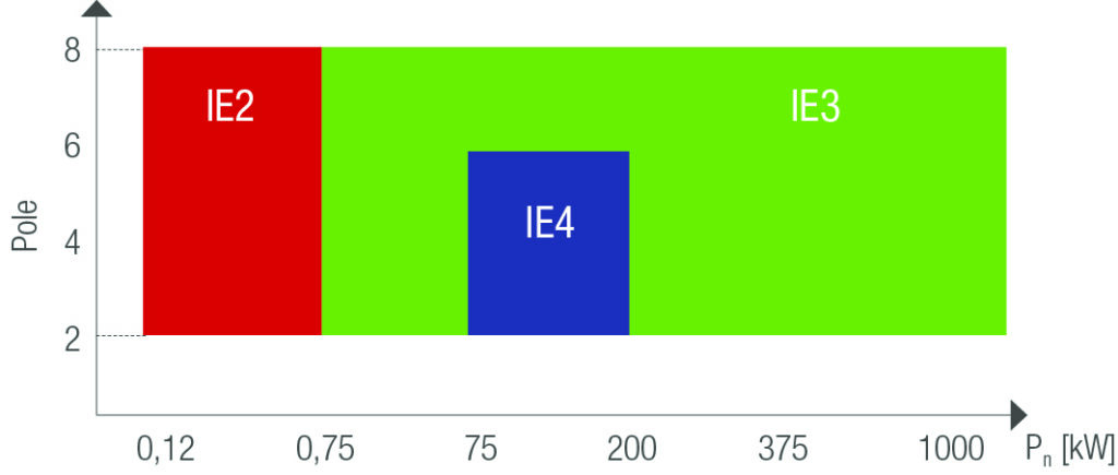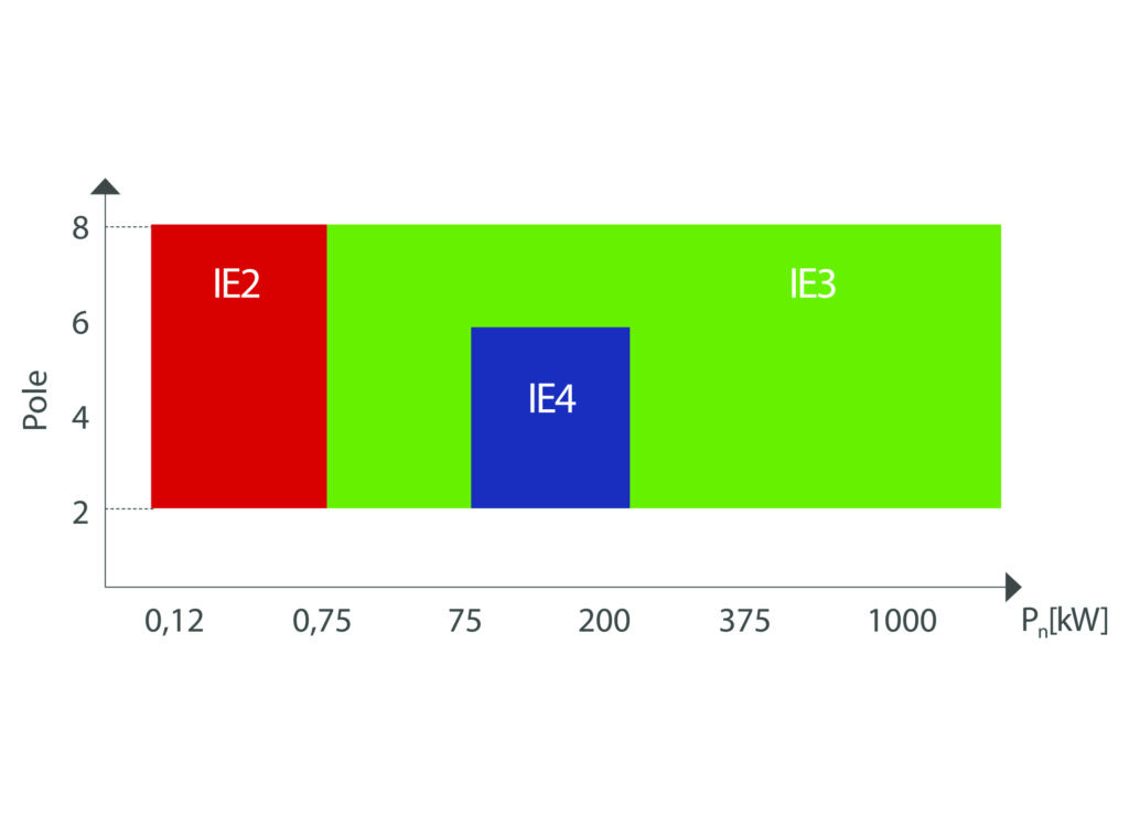 Mit der Vorgabe, 20 Prozent der IE2-Motorverluste einzusparen, kommen viele Asynchronmotoren an ihre physikalischen und teilweise wirtschaftlichen Grenzen. In einigen Motorgrößen bedeutet das für die Hersteller den Einsatz deutlich teurer Kupferrotoren, um einen Baugrößensprung zu vermeiden. Für den Getriebeanbau bedeutet der IE3-Motor, dass die Flansche durch höheres Motorgewicht stärker belastet werden. Mit der Jahresmitte 2021 entfiel im Geltungsbereich der Ökodesign-Richtlinie die legale Möglichkeit den IE3-Motor durch IE2-Motoren in Kombination mit Frequenzumrichtern zu umgehen. Dadurch sind die Verkaufszahlen der IE3-Motoren stark angestiegen. Das gilt auch schon für 2-, 6- und 8-polige Motoren, auch wenn hier die Zahlen deutlich geringer sind, als bei 4-poligen Ausführungen. Für die Leistungen von 75 bis 200kW wurde in der Richtlinie bereits eine Weichenstellung für 2023 aufgenommen, dann wird die IE4-Klasse auch für die Standard-Asynchronmotoren größerer Leistungen Realität. Mit den Baugrößen wachsen auch die Effizienzwerte. Deshalb sind die Differenzen zwischen IE3- und IE4-Motoren physikalisch leichter und mit weniger Anpassungen erreichbar.