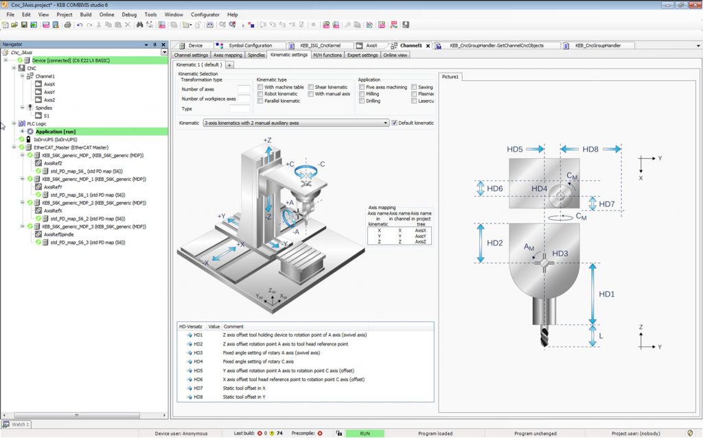 Für die Umsetzung von High-End-Anwendungen wurde der CNC-Kern auf echtzeitfähigen IPC-Steuerungen implementiert. Eingerichtet wird das System benutzerfreundlich über das Automatisierungs-Tool Combivis Studio 6. Dessen objektorientierte Gestaltung unterstützt Anwender bei der Konfiguration der Achsen und Kanäle. KEB ermöglicht es CNC-Maschinenherstellern, ihre Lösungen mit offenen Tools basierend auf Standards wie IEC61131 zu automatisieren, ohne die CNC-Funktionen einzuschränken. So können Maschinenbauer eine individuelle Lösung je nach Bedarf erstellen.