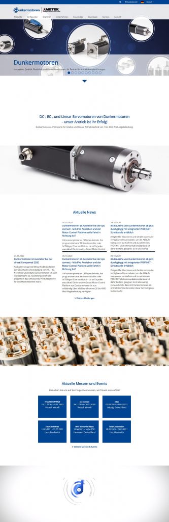 Nachdem eine erste Komplettüberarbeitung der Website von Dunkermotoren bereits 2016 erfolgte, erstrahlt diese jetzt in einem neuen Design. Das Facelift konzentrierte sich vor allem auf die Anpassung an aktuelle Trends sowie Designs. Das Layout ist im Vergleich zur Vorgängerversion von einer neuen Bildsprache geprägt. Dadurch wurde z.B. die Funktion des Parallax beim Scrollen auf der Seite integriert. Das neue Full-Screen-Design ermöglicht eine optimale Darstellung der Website je nach Bildschirmgröße. Dadurch ist eine Konfiguration von Antriebslösungen im Online-Konfigurator noch komfortabler als bisher. Die Integration von Bewegtbild soll dem Besucher ein neues Erlebnis der Applikationen bieten. Die größte Anpassung der Website zeigt sich wohl im Karrierebereich, der inhaltlich komplett neu aufbereitet wurde. In Testimonials berichten Mitarbeiter von Ihren Erfahrungen als Arbeitnehmer bei Dunkermotoren.