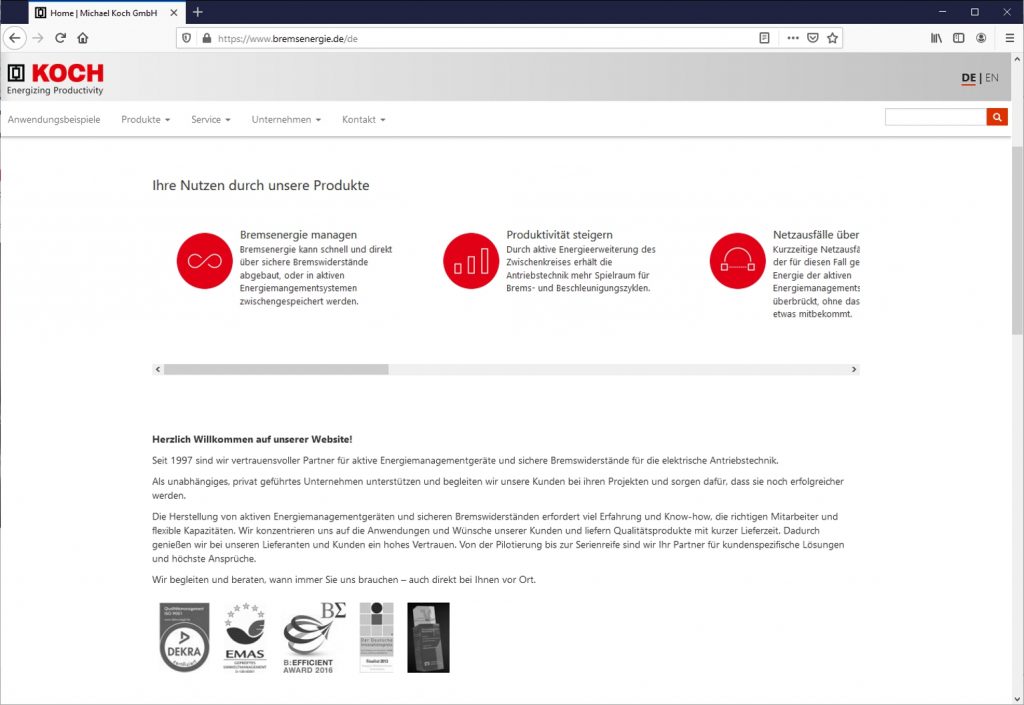 Im neuen Look präsentiert sich die Michael Koch GmbH als Anbieter von aktiven Energiemanagementgeräten und sicheren Bremswiderständen mit seiner Website www.bremsenergie.de. Der komplett überarbeitete Auftritt soll die Intention des Unternehmens unterstreichen, sich im digitalen Raum stärker zu engagieren. Im Fokus des Relaunchs steht eine intelligente Benutzerführung auf der Basis von User-Experience-Untersuchungen. Auf der Seite werden die Nutzen der Produkte deutlich hervorgehoben, anhand vieler Beispiele der Anwendungsmöglichkeiten wird der User angesprochen und zu individuellen Lösungsmöglichkeiten hingeführt. Mit der übersichtlichen Navigation sind detaillierte Produktinformationen, Beispielapplikationen, Ansprechpartner und weitere Informationen leicht zu finden. Technische Detailinformationen sowie Prospekte und Datenblätter sind zudem als Downloads zu haben.