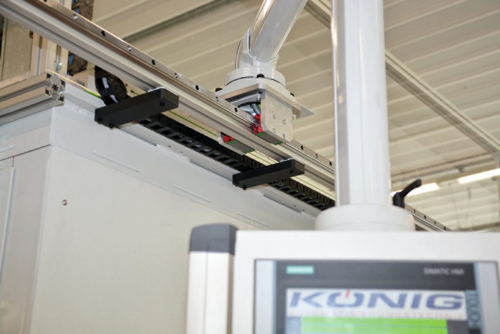 Ein kartesisches Dreiachssystem, ein Drehtisch, ein Stapelmagazin und ein Bearbeitungszentrum – das sind die wichtigsten Bestandteile einer neuen Fertigungszelle von König Automatisierungstechnik. Mit nur geringem Umrüstaufwand lässt sich die Zelle für die Serienproduktion unterschiedlicher Teile einsetzen und erreicht trotzdem einen hohen Durchsatz. Die Automatisierung ist so ausgelegt, dass die Zelle mit einer Zykluszeit von 15 Sekunden arbeiten kann. Bei dieser Taktgeschwindigkeit wird die Bearbeitungsmaschine nicht ausgebremst und es können hohe Spindellaufzeiten erreicht werden. In der Praxis sind die Bearbeitungszeiten pro Teil in der Regel wesentlich höher, sodass die Automatisierungslösung in diesen Fällen sogar mehrere Werkzeugmaschinen gleichzeitig mit Rohteilen versorgen bzw. die anfallenden Fertigteile abtransportieren kann.