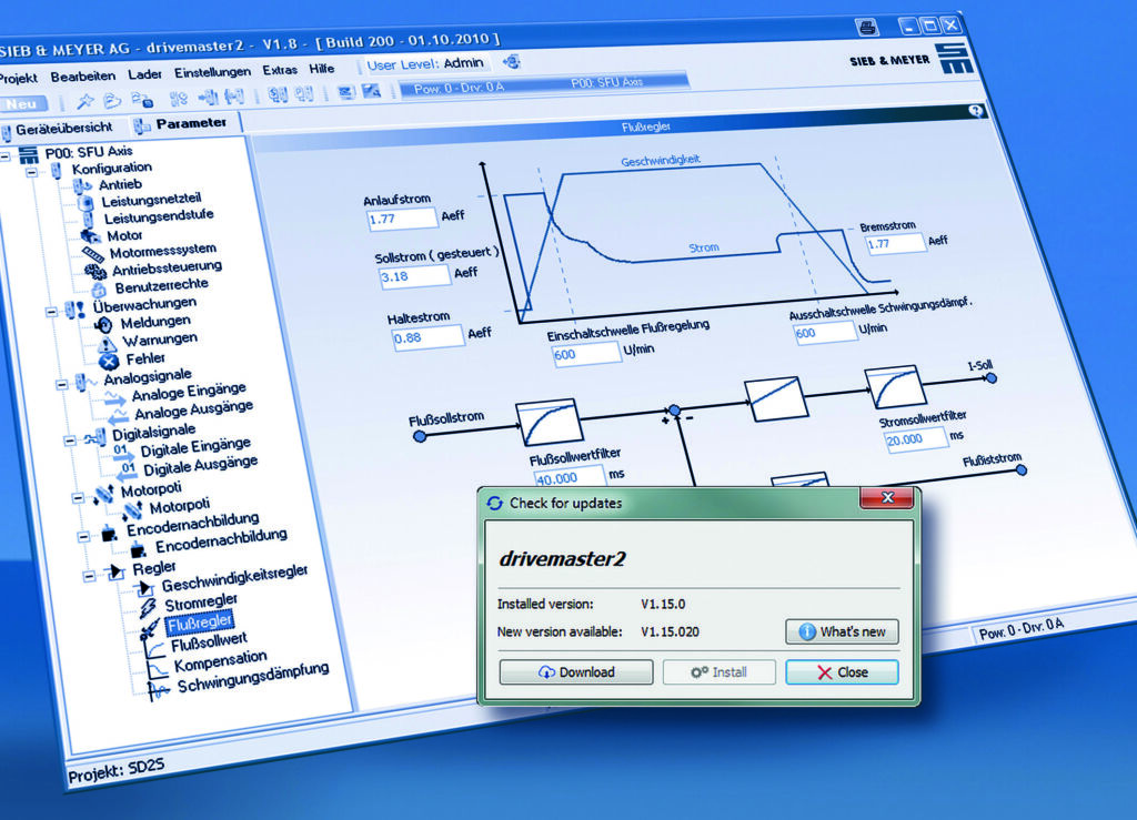 Der Frequenzumrichter ist im Schaltschrank der Plek-Maschine verbaut. Es gibt zwei Typen von High-Speed-Spindeln, die an ihn angeschlossen werden. Für jeden Spindeltyp existiert ein eigener Motorparametersatz, der bei der Inbetriebnahme der Plek-Maschine mit der Parametrier- und Inbetriebnahme-Software Drivemaster2 von Sieb & Meyer in den Umrichter geladen wird. „Im Betrieb treibt dieser den Spindelmotor an, die Parameter werden aus einem PC-Programm über eine serielle Schnittstelle an den SD2B plus übermittelt“, erklärt Jens Baae. „Wenn die Spindeln laufen, werden die aktuellen Betriebsparameter wie Drehzahl und Strom vom PC ausgelesen. Zusätzlich werden über die digitale I/O-Schnittstelle generelle Maschinenzustände und Befehle übertragen.“