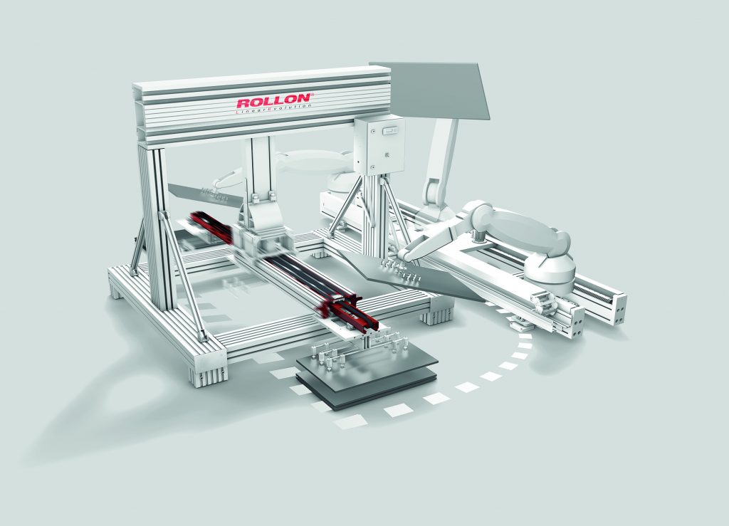 An einem Anwendungsbeispiel zeigt Rollon wie Roboteranwendungen um eine Achse erweitert werden können. Dabei bewegt sich der komplette Roboter auf einer bodennahen Linearachse und bedient ein kartesisches Linearachssystem mit Teleskop-Feeder. Verfahren werden können kleine bis mittlere Roboter mit maximal 2t Eigengewicht. Prismatische Laufrollenführungen oder Profilschienenführungen in Kombination mit einem Zahnstangenantrieb sollen dabei Dynamik und Belastbarkeit garantieren. Die Anwendungsgebiete sind Palettierung, Produktionsstraßen und Logistik. So kann der Knickarmroboter auf der Linearachse parallel zu einer Produktionsstraße mitlaufen und dabei Manipulationen vornehmen. Auch zum mobilen Feeder-Roboter, der mehrere Aufgabepunkte für Werkstücke bedient, lässt er sich leicht erweitern. Des Weiteren eignet er sich für Pick&Place-Systeme, die hohe Kräfte aufnehmen und genau positionieren müssen.