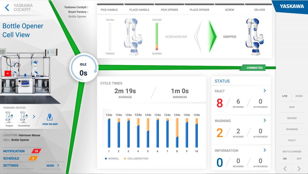 Mit Cockpit präsentiert Yaskawa eine zentrale Softwareplattform für vernetzte Produktionsumgebungen und setzt dabei unter anderem auf die Standardschnittstelle OPC UA. So sollen relevante Prozess- und Systemdaten aus vernetzten Produktionsanlagen in einer skalierbaren Datenbank in Echtzeit gesammelt, analysiert oder für die externe Weiterverarbeitung aufgearbeitet werden. Die Visualisierung erfolgt in der Softwareplattform, wobei der aktuelle Status jeder Maschine in Echtzeit abgebildet und mit anderen Datenquellen in Beziehung gesetzt werden kann, z.B. zur geplanten Produktionsmenge. Die Funktionen des Systems sollen sich in der Praxis sowohl im Zusammenspiel von Robotics-Live-Zellen als auch mit Steuerungs- und Antriebstechnik des Herstellers zeigen: So erkennt und meldet die Softwareplattform einen verstopften Luftfilter ohne den Einbau zusätzlicher Sensoren allein durch das Monitoring des Stromflusses.