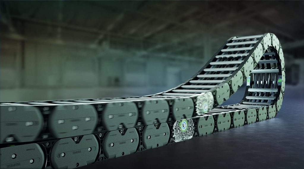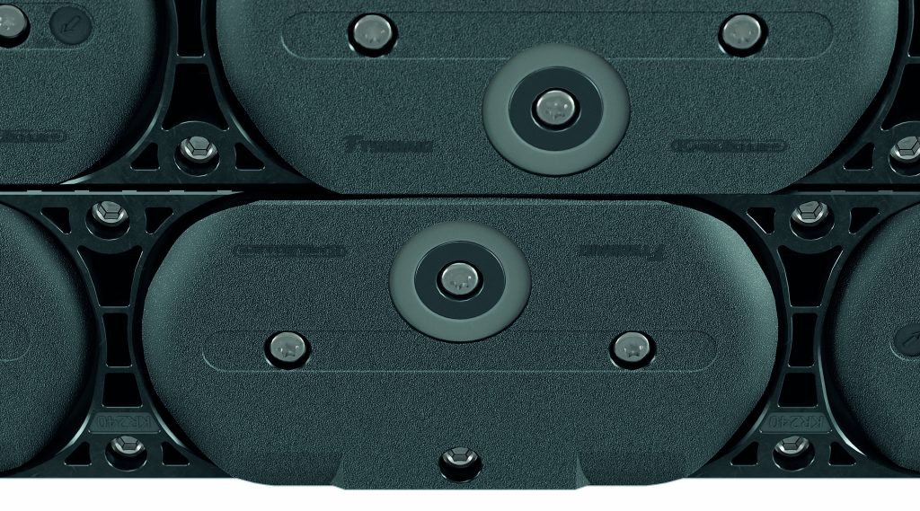 Hinter der Leistungsfähigkeit der neuen Energiekette steckt ein besonderes Designkonzept: So sorgt etwa die symmetrisch angeordnete Längsachse für eine sehr gute Kraftübertragung im Kettensystem und eine Reduzierung der im Kettendrehpunkt auftretenden Momente. Das gekapselte Anschlagsystem, die schmutzunempfindliche selbstreinigende Außenkontur und die verstärkte Bolzenbohrungsverbindung erfüllen hohe Anforderungen in Sachen Robustheit. Auch die massiven Seitenbänder tragen aufgrund der verschraubten Kettenglieder und einer speziellen Doppelgabel-Laschen-Konstruktion zur Stabilität der Kette bei.