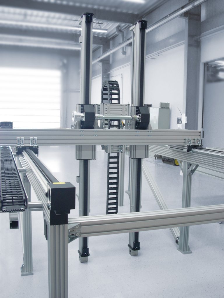 Diese zweiachsigen Handlingsysteme mit Verfahrwegen in X- und Z-Richtung werden für Erlenbach von RK Rose+Krieger nach entsprechenden Vorgaben aus Aluminiumprofilen und Profillinearachsen gefertigt. Jüngstes Beispiel dafür ist ein Zweiachsportal für das Überkopf-Handling von Formteilen für einen Hersteller von Dekorations- und Dämmprodukten sowie technischen Formteilen und Fußbodenheizungssystemen aus Kunststoffen. Das Handling-System kommt in einer Anlage zum Ausschäumen von C-Profilen aus Kunststoff zum Einsatz. Dabei übernimmt die an der Z-Achse montierte Saugerplatte der Hubstation pro Zyklus jeweils sechs Kunststoffleisten automatisch aus einem Magazin, transportiert sie über die Maschine hinweg zum Werkzeug und übergibt sie dort passgenau in die eine Werkzeughälfte. Nach dem Schließen des Werkzeugs werden die Leisten, die einem C-Profil ähneln, ausgeschäumt. Wird der Transport- und Übergabevorgang nicht präzise ausgeführt – liegen also die Profile nicht korrekt im Werkzeug – kommt es zu Überfüllungen oder Gratbildungen, die eine zeitraubende Nachbearbeitung erforderlich machen. Für die Anlage kombinierte RK Aluminiumkonstruktionsprofile der Baugröße 80×80 und 80×160 aus dem hauseigenen Baukasten mit Profillinearachsen vom Typ SQZ (Baugröße 80×160) und SQ-MT (Baugröße 80×120) zu einem Zweiachsportal. Dabei bilden zwei jeweils ca. 4.200mm lange SQZ-Zahnriemenachsen die X-Verstellung. Sie sind im Abstand von 1.695mm parallel montiert und über eine Übertragungseinheit verbunden. Als Z-Verstellung fungieren zwei, im Abstand von ca. 600mm parallel angeordnete Zahnriemenachsen vom Typ SQ-MT, die wiederum über eine Übertragungseinheit gekoppelt sind. Sie sind über einen Aufnahmerahmen aus Konstruktionsprofilen der Baugröße 80×160 angeschlossen und nehmen in der Anwendung eine Traglast von 75kg auf. Ihr Arbeitshub beträgt ca. 1.250mm.