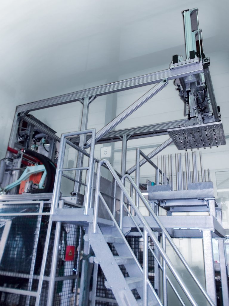 Die Konstruktion des Zweiachsportals ist robust genug, um einen Dreischichtbetrieb und feuchtes Hallenklima bei ca. 60°C Raumtemperatur unbeschadet zu überstehen. RK Rose+Krieger liefert die Handling-Station transportfertig an Erlenbach aus. Dort werden Motor, Getriebe und Steuerungen sowie die Greifertechnik ergänzt. Bevor Erlenbach dann die Anlage beim Kunden final montiert und in Betrieb nimmt, wird sie nochmal komplett errichtet, verkabelt, in die gesamte Maschine integriert und in Betrieb genommen.