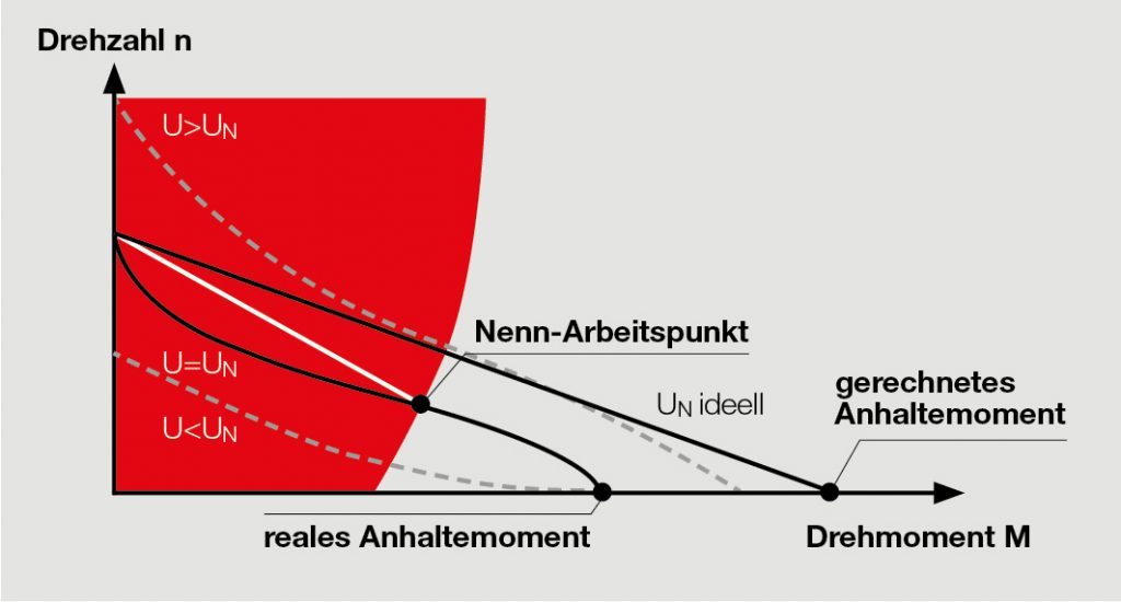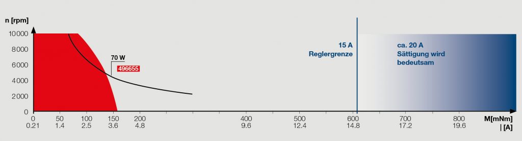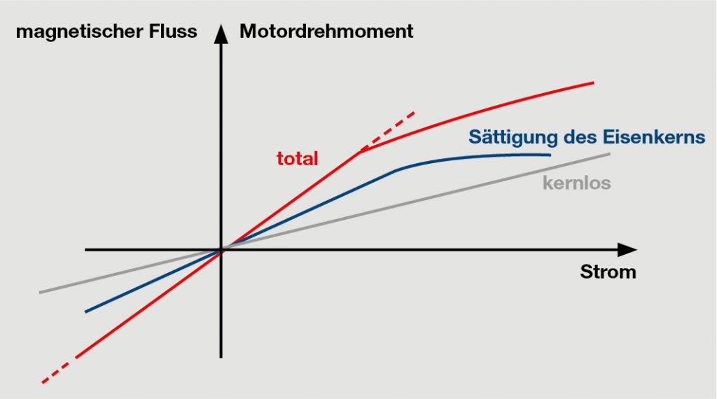 Werden die Ströme größer, sättigt sich der Eisenkern im Magnetfeld der Spule. Sättigung bedeutet, dass alle internen magnetischen Momente des Eisens gänzlich ausgerichtet sind. Eine Erhöhung des äußeren Feldes (mehr Strom) hat keinen Einfluss mehr auf die Magnetisierung; es steigt nur noch der Fluss der Spule selber an. Anders gesagt: Um mehr Drehmoment aus dem Motor zu kriegen, ist viel mehr Strom nötig. Oder auch: Mit derselben Stromerhöhung wird nur wenig zusätzliches Drehmoment erzeugt. Die Drehmomentkonstante wird kleiner. Sättigung tritt bei hohen Strömen auf. Das bedeutet aber auch, dass die Abweichungen von den spezifizierten Werten nur im Kurzzeitbetrieb auftreten. Im Wesentlichen sind nur zwei Parameter betroffen: Anlaufstrom und Anhaltemoment.