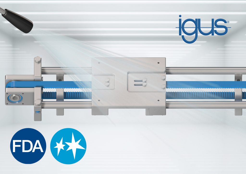 Igus hat eine anschlussfertige Zahnriemenachse entwickelt, die nach den Richtlinien des Hygienic Designs konstruiert ist. Sie setzt auf FDA-konforme Materialien und schmier- und wartungsfreie Hochleistungskunststoffe. Um den Reinigungsaufwand bei Anlagen in der Lebensmittelindustrie oder auch in der Pharma- und Kosmetikbranche zu senken, lässt sich das neue Modell besonders schnell und gründlich reinigen, mit dem Hochdruckdampfstrahler, mit Chemikalien oder einfach nur mit fließendem Wasser. Hinterschneidungen, in denen sich Lebensmittelreste unbemerkt ablagern könnten, wurden reduziert und sogar Spalten in der Größenordnung eines Millimeterbruchteils, die z.B. durch eingesenkte Schraubenköpfe entstehen, vermieden.