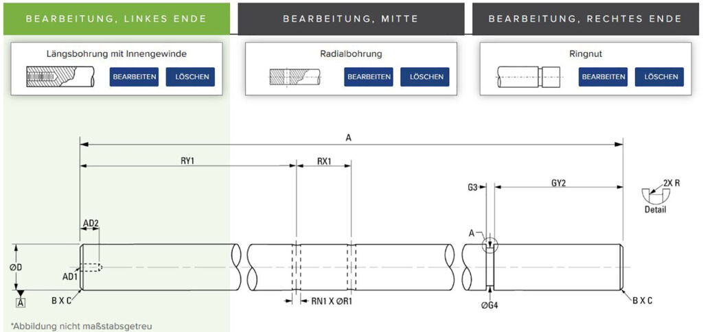 Thomson Industries bietet in seinem Online-Wellenkonfigurator ab sofort auch Sonderbearbeitungsoptionen. Damit sollen Kunden den Zeitaufwand zur individuellen Spezifikation einer Rundwelle von mehreren Stunden auf nur wenige Minuten reduzieren. Bisher konnte das Tool dafür genutzt werden, um Werkstoff, Größe oder andere Standardeigenschaften festzulegen. Wenn jedoch eine bestimmte Sonderbearbeitung wie Gewinde, Abflachungen, Ringnuten oder Radialbohrungen benötigt wurden, musste eine Zeichnung eingereicht oder die Welle im direkten Gespräch mit einem Vertriebsingenieur konfiguriert werden. Jetzt können Nutzer die Sonderbearbeitung einer Welle eigenständig konfigurieren. Dabei wird eine interaktive 2D-Darstellung in Echtzeit aktualisiert, die sofort anzeigt, wie sich eine Änderung auf das Design, den Preis und die Lieferzeit auswirkt. Darüber hinaus werden konstruktive Fehler ausgeschlossen, wie etwa Abstandskonflikte oder eine für den spezifizierten Durchmesser zu große Radialbohrung, denn es werden nur solche Optionen zur Auswahl angeboten, die zur jeweiligen Konfiguration passen.