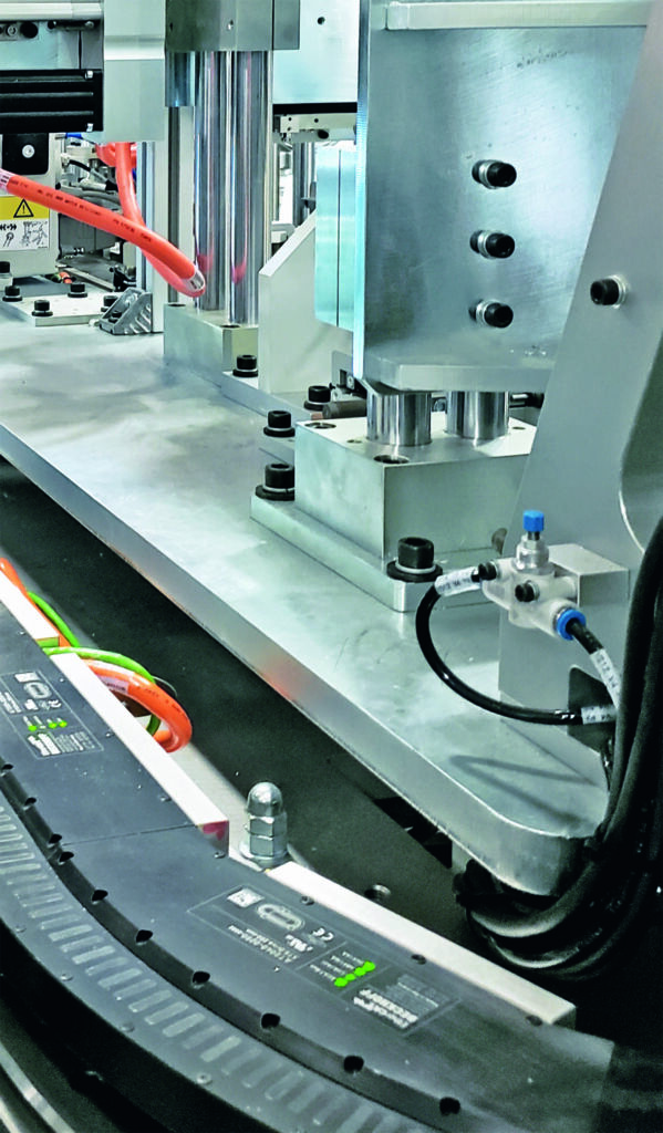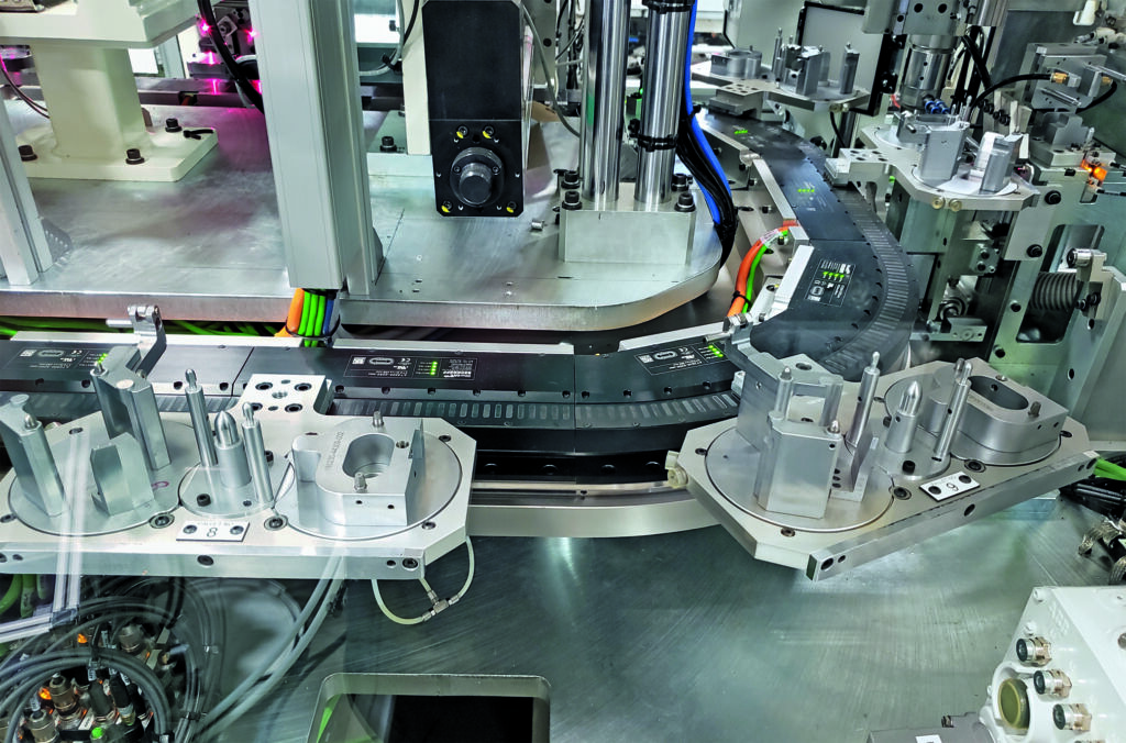 Die XTS-basierte Montagelinie besteht aus vier separaten Zellen mit mehr als 50 Stationen für Pressen, Löten, Schrauben, Ebenheitskontrolle mit LVDTs, Dispensen, Plasmabehandlung, Dichtheitsprüfung, Inspektion etc. Viele Stationen erfordern eine präzise Synchronisation mit der Robotertechnik. In den ersten drei Maschinenzellen werden die Pumpen auf palettenförmigen Werkstückträgern platziert, die an den XTS-Movern montiert sind. Das XTS-System der ersten Zelle hat eine Tracklänge von 12m und nutzt 18 Mover, in der zweiten sind es 6m und zwölf Mover und in der dritten Zelle 10m und 18 Mover. Die sorgfältig berechneten Geometrien der Werkstückträger ermöglichen eine Positioniergenauigkeit im Mikrometerbereich. Wenn die Montagevorgänge in einer Zelle abgeschlossen sind, bewegt der Bediener die Pumpe zur nächsten. In der vierten Zelle hebt ein Roboter die fertige Pumpe für eine abschließende Sichtprüfung vor zwei GigE-Vision-Kameras und legt sie dann auf ein Abführband.