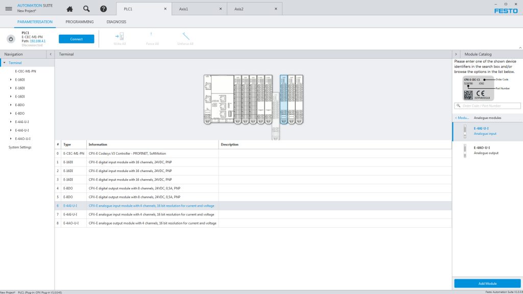 Die PC-basierte Software Festo Automation Suite vereint Parametrierung, Programmierung und Wartung elektrischer Automatisierungskomponenten. In wenigen Schritten ermöglicht sie laut Anbieter die Inbetriebnahme eines kompletten Antriebspakets – von der Mechanik bis hin zur Steuerung. Die Grundfunktionen der Komponenten sind bereits vorab integriert. Durch Plug-ins und Erweiterungen lässt sich die Software individuell auslegen. Gerätebeschreibungsdaten, Handbücher und Applikationsbeschreibungen können direkt aus der Software heruntergeladen werden. Bei der Inbetriebnahme werden unterschiedlicher Geräte per Drag&Drop dem Projekt zugefügt und miteinander verbunden. Beim neuen Plug-in des Servoantriebsreglers CMMT-AS führt der integrierte Assistent in nur fünf Schritten sicher und bequem zum voll lauffähigen Antriebssystem. In Kombination mit dem Automatisierungssystem CPX-E gelingt auch die Einbindung in die Steuerung unkompliziert. Die Software bindet erforderliche Treiberbausteine automatisch ins Programm ein und berechnet wichtige Parameter im Hintergrund. Dabei kommt die optionale Codesys-Erweiterung für die weiterführende Programmierung von Motion-Control- und Robotikfunktionen zum Einsatz.
