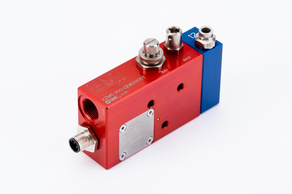 Das Two-Speed-Valve von SMC ist ein standardisiertes, sicheres Ventil zur pneumatischen Umschaltung der Betriebsarten nach VDMA66416 und EN12417. Inkludiert ist eine Ventilstellungsabfrage, samt Signal an die Sicherheits-SPS. Das Ventil VZM5-300-CEW20057 besteht aus einem pneumatisch angesteuerten Ventil, zwei Drosseln und einer Ventilschieberabfrage in einem rot eloxierten Aluminiumgehäuse. Mit diesem sollen sich alle gängigen Betriebsarten einer Maschine wie Einrichtbetrieb, Wartungs- und Instandhaltungsbetrieb sicher realisieren lassen. Gleichzeitig verfügt das Produkt über eine sichere Erkennung der Ventilstellung. Diese wird mittels eines Wechselkontakts an die übergeordnete SPS weitergegeben. Montiert wird das Ventil entweder nah am Zylinder oder direkt am Antrieb. Bei einer Fehlersuche ist auf den ersten Blick eine schnelle und zuverlässige Zuordnung von Ventil und Zylinder möglich. Das Auslegen in individuell aufgebaute Konstruktionen entfällt. Fittinge und Drosseln sind in Metall ausgeführt. So sollen sie gegenüber vielen Medien resistent und dauerhaft beständig sein. Der elektrische Anschluss erfolgt über einen M12-Stecker. Das Ventil kann bei Wartungs- oder Instandhaltungsarbeiten über eine Handsteuerung außerhalb des Gefahrenbereichs bedient werden.