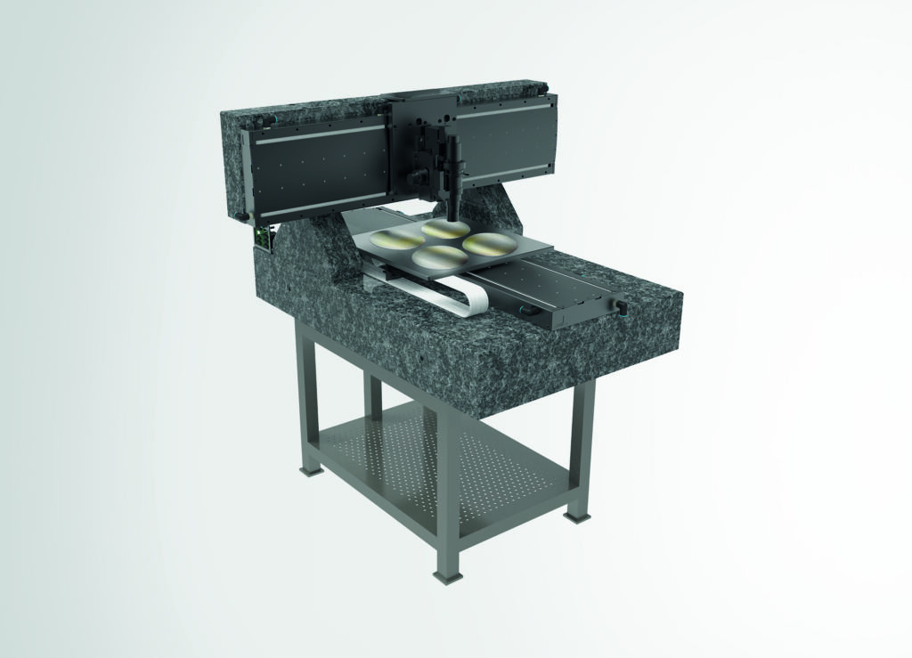 Das XYZ-Positioniersystem zur automatisierten Inspektion hat Steinmeyer Mechatronik speziell für die Qualitätskontrolle von großen Wafern, Probecards und Leiterplatten entwickelt. Es erlaubt die Hochgeschwindigkeitspositionierung entlang zweier linearer Achsen und gewährleistet einen erhöhten Throughput. Das Inspektionssystem mit Verfahrwegen bis 720mm erlaubt die gleichzeitige Überprüfung mehrerer 300mm-Wafer oder einzelner bis 700x700mm großer Substrate mit Spitzengeschwindigkeiten von bis zu 1.000mm/s. Eisenlose Direktantriebe machen dieses hohe Tempo möglich. Aufgrund der Wiederholgenauigkeit von 0,3µm lassen sich präzise Messergebnisse erzielen. Die Z-Achse wurde für Sensoren und Kamerasysteme bis 5kg konzipiert. Die Vertikalverstellung kann dabei wahlweise fest, manuell, motorisch mit Spindel oder dynamisch mit pneumatisch entlastetem Direktantrieb für Höhenkompensation bei voll interpolierter Bewegung erfolgen. Auch die Prüflingsauflage ist applikationsspezifisch anpassbar, zur Wahl stehen geschliffene Platte, Platte mit Bohrraster und Chuck. Bei dem XYZ-System handelt es sich um eine Komplettlösung inklusive Stahlgestell und Luftdämpfern, wobei letztere zusammen mit der massiven, schweren Grundplatte aus Granit eine hervorragende Entkopplung gegenüber Bodenvibrationen sicherstellen – ideal für Messungen mit µm- und sub-µm-Auflösung. Befestigungsbohrungen für Gehäuseanbauten sind vorhanden. Das Inspektionssystem wird mit voll vermessener Genauigkeit sowie angepasster Verkabelung und Vakuumführung entsprechend der eingesetzten Sensorik und Wafer-Aufnahme geliefert und lässt sich durch Portalaufbau einfach in bestehende Linienprozesse integrieren. Eine Ausführung für höchste Reinraumansprüche bis ISO1 mit interner Absaugung und Partikelfallen ist optional verfügbar. Die Steuerung erfolgt über einen separaten Motion-Controller für drei Achsen, der sich unkompliziert in die vorhanden Steuerungsumgebungen einbinden lässt. DLL und API zur aufwandsarmen Softwareintegration sind erhältlich, ebenso Beckhoff oder ACS. Ein flexibles Wartungskonzept soll geringen Aufwand bei der Instandhaltung ermöglichen.