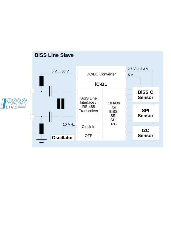 Mit dem Protokollwandler iC-BL lassen sich beliebige Biss-C-, SSI-, SPI- und I2C-Sensoren in das Biss-Line-System einbinden. So können über die zehn I/O-Pins des Bausteins z.B. Positionsdaten eines Biss-C-Sensors, Daten eines Beschleunigungssensors via SPI und Temperaturdaten eines I2C-Sensors übertragen werden. Da Biss Line eine bidirektionale Kommunikation unterstützt, ist auch die Konfiguration der angeschlossenen Sensoren und die Übertragung von Aktordaten an die Teilnehmer möglich. Um unterschiedliche Sensortechnologien unterstützen zu können, verfügt der Wandler über einen integrierten Spannungswandler, sodass aus einer Eingangsspannung von bis zu 30V Sensoren mit einer Spannung von 5, 3,3 oder 2,5V und bis zu 200mA versorgt werden können. Durch den integrierten OTP-Speicher (one-time programmable) ist kein externes EEPROM zum Ablegen der Konfiguration des iC-BL erforderlich.